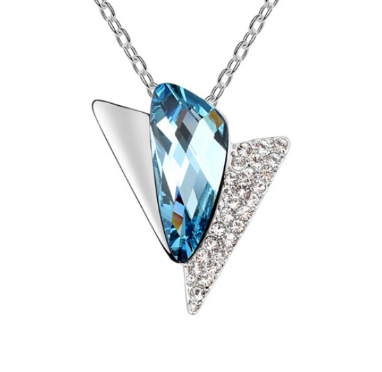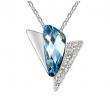 Dije con cadena en baño de oro blanco de 18 quilates, diseño de triangulo con incrustaciones de cristales en color azul y blanco. Fabricado en una estructura de aleación de platino con rodio sin níquel.