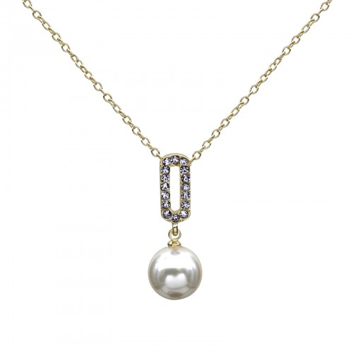 Hermoso dije en baño de oro amarillo de 18 quilates, con detalle de perla blanca e incrustaciones de cristales en color blanco. Fabricado en una estructura de aleación de platino con rodio sin níquel.