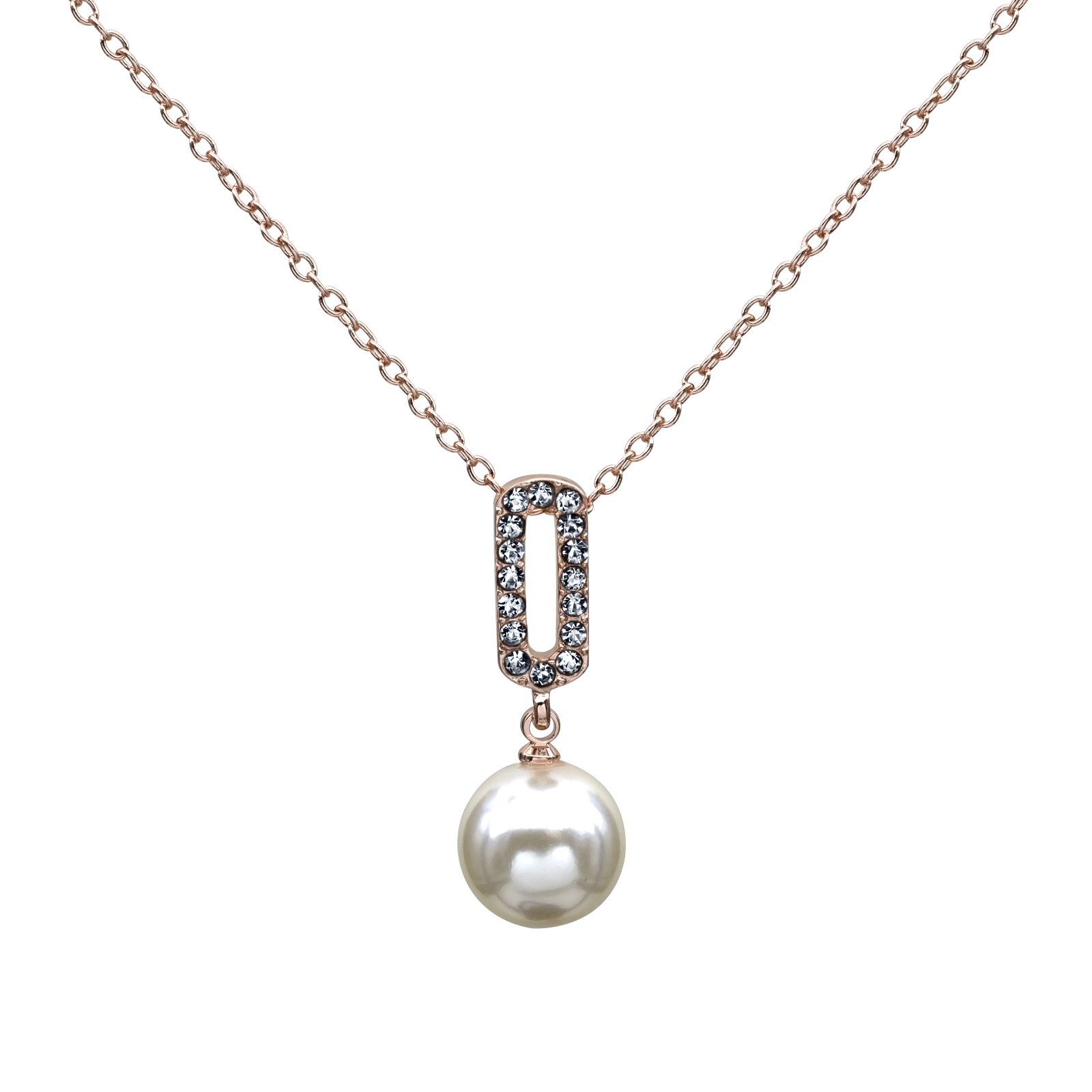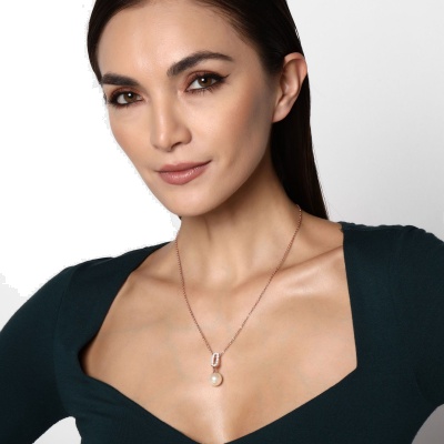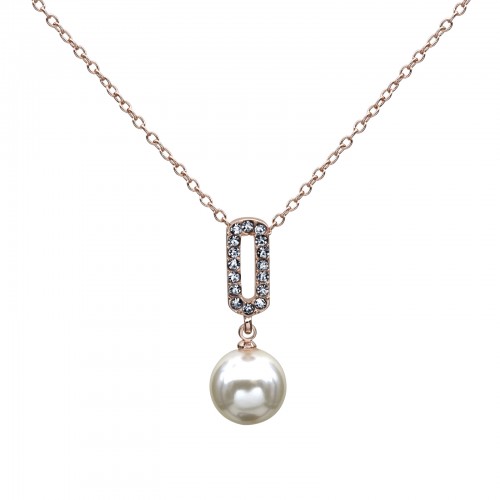 Dije en baño de oro rosa de 18 quilates, fino diseño con detalle de perla blanca e incrustaciones de cristales en color blanco. Fabricado en una estructura de aleación de platino con rodio sin níquel.
