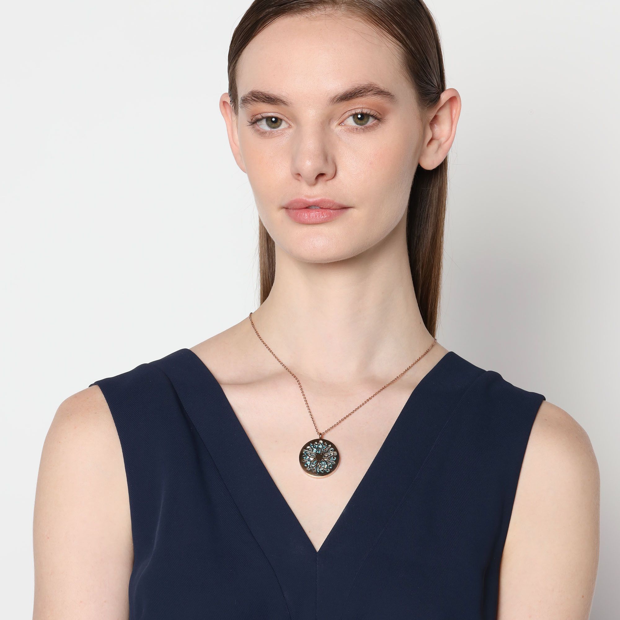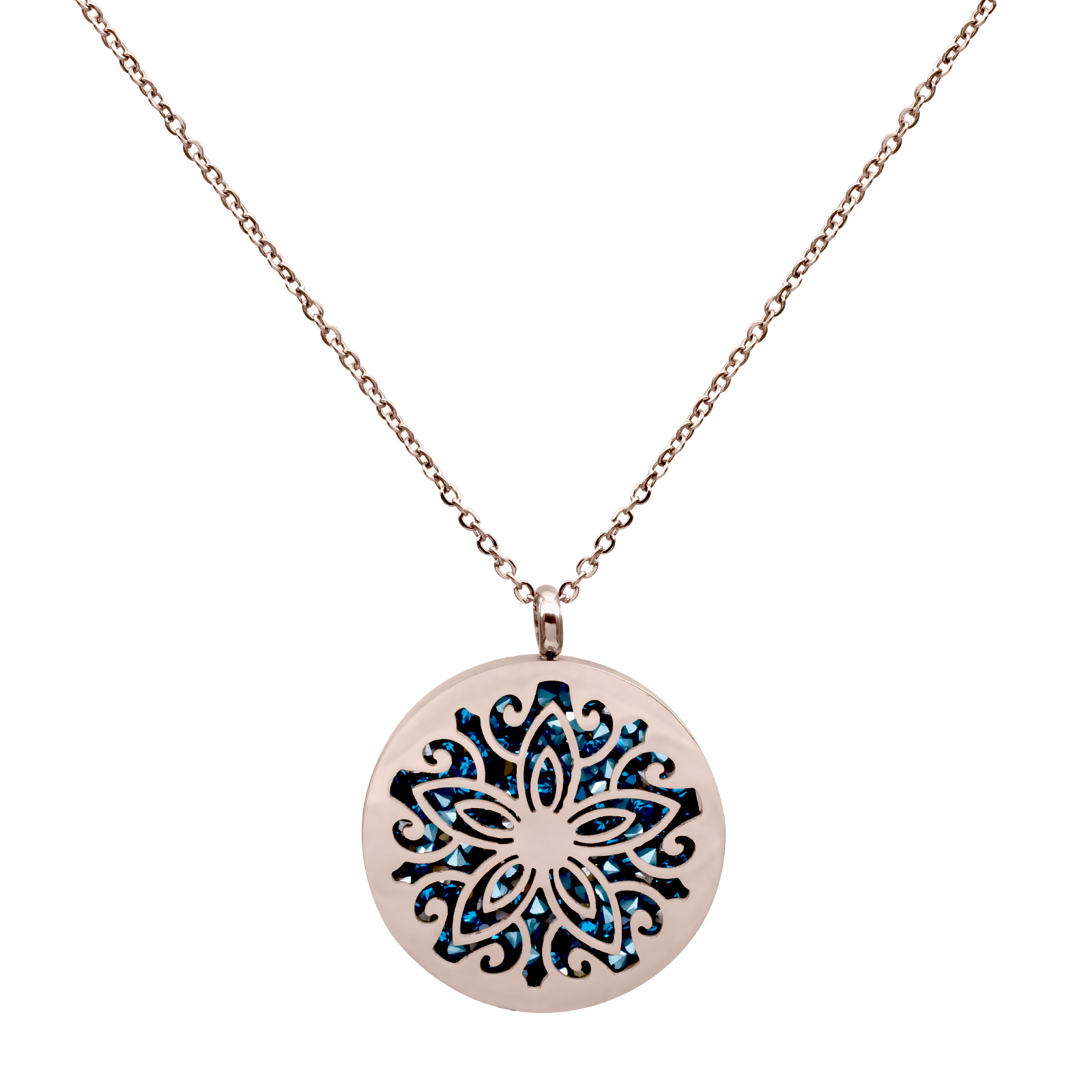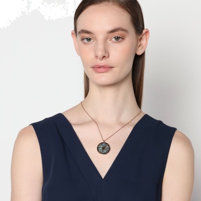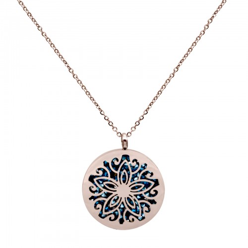 Lindo collar en baño de oro rosa de 18 quilates, diseño de circulo calado con incrustaciones de cristales en color verde. Fabricado en Acero Inoxidable.