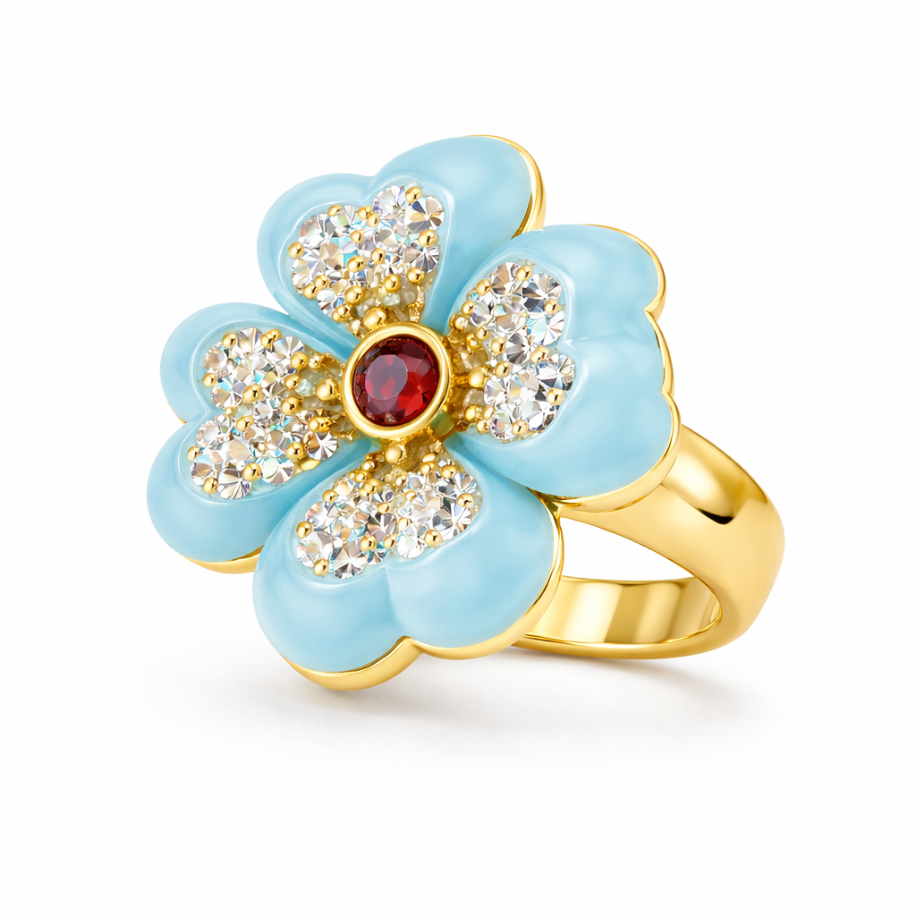 Delicado anillo en baño de oro amarillo de 18 quilates, con pétalos de cristal celeste opaco e incrustaciones de cristales blancos. Fabricado en una estructura de aleación de platino con rodio sin níquel.