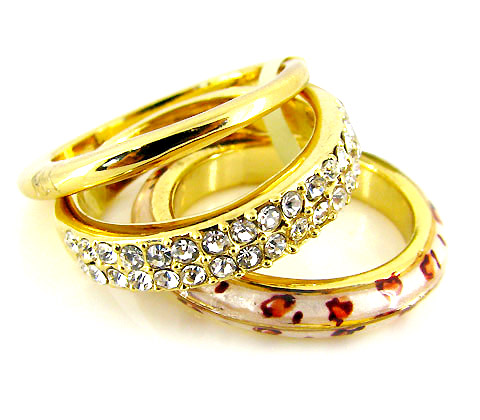 Juvenil anillo triple, en baño de oro amarillo de 18 quilates, con acabado animal print e incrustaciones de cristales blancos. Fabricado en una estructura de aleación de platino con rodio sin níquel.