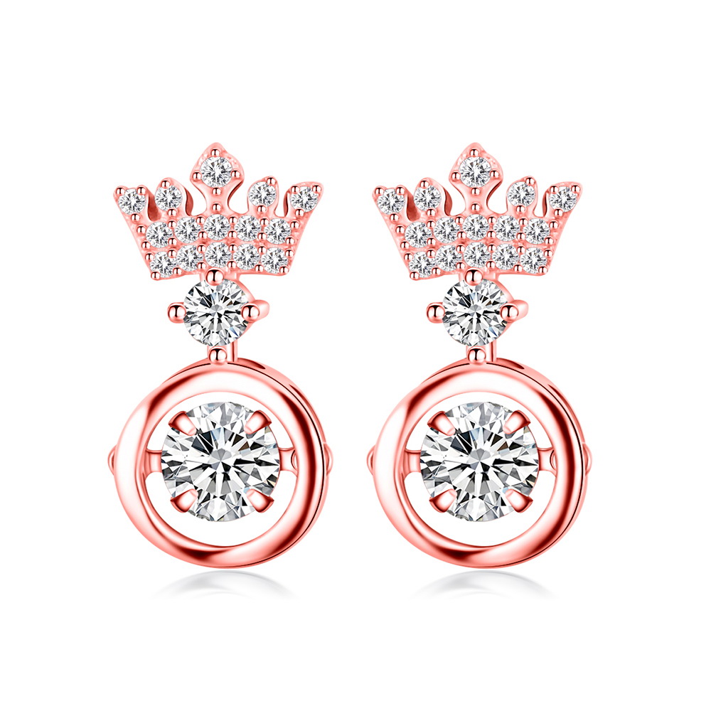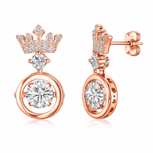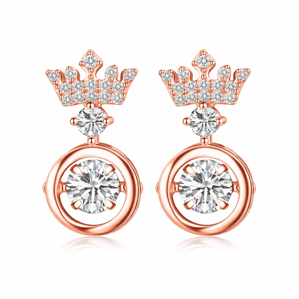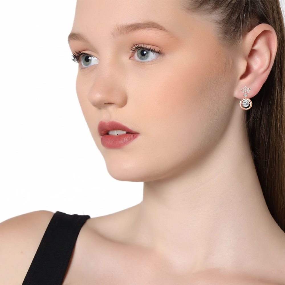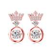Lindos aretes en baño de oro rosa de 18 quilates, diseño de corona con incrustaciones de cristales en color blanco. Fabricado en una estructura de aleación de platino con rodio sin níquel.