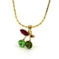 Lindo dije con fina cadena en baño de oro amarillo de 18 quilates, diseño de cereza e incrustaciones de cristales en tono rojo y verde.