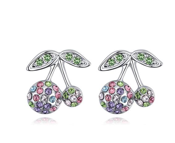 Hermosos aretes en baño de oro blanco de 18 quilates, diseño de pequeñas cerezas con incrustración de cristales en colores. Fabricado en una estructura de aleación de platino con rodio sin níquel.