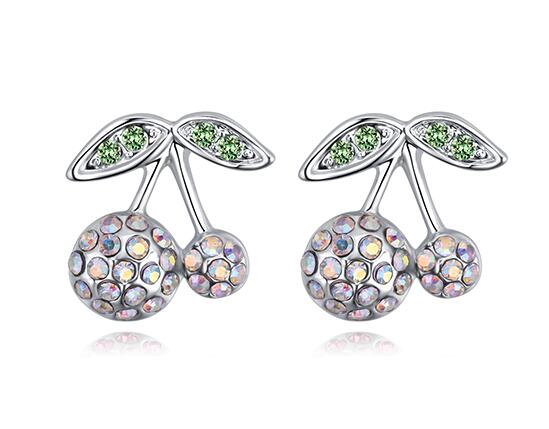 Hermosos aretes en baño de oro blanco de 18 quilates, diseño de pequeñas cerezas con incrustración de cristales en color tornasol y verde. Fabricado en una estructura de aleación de platino con rodio sin níquel.