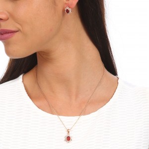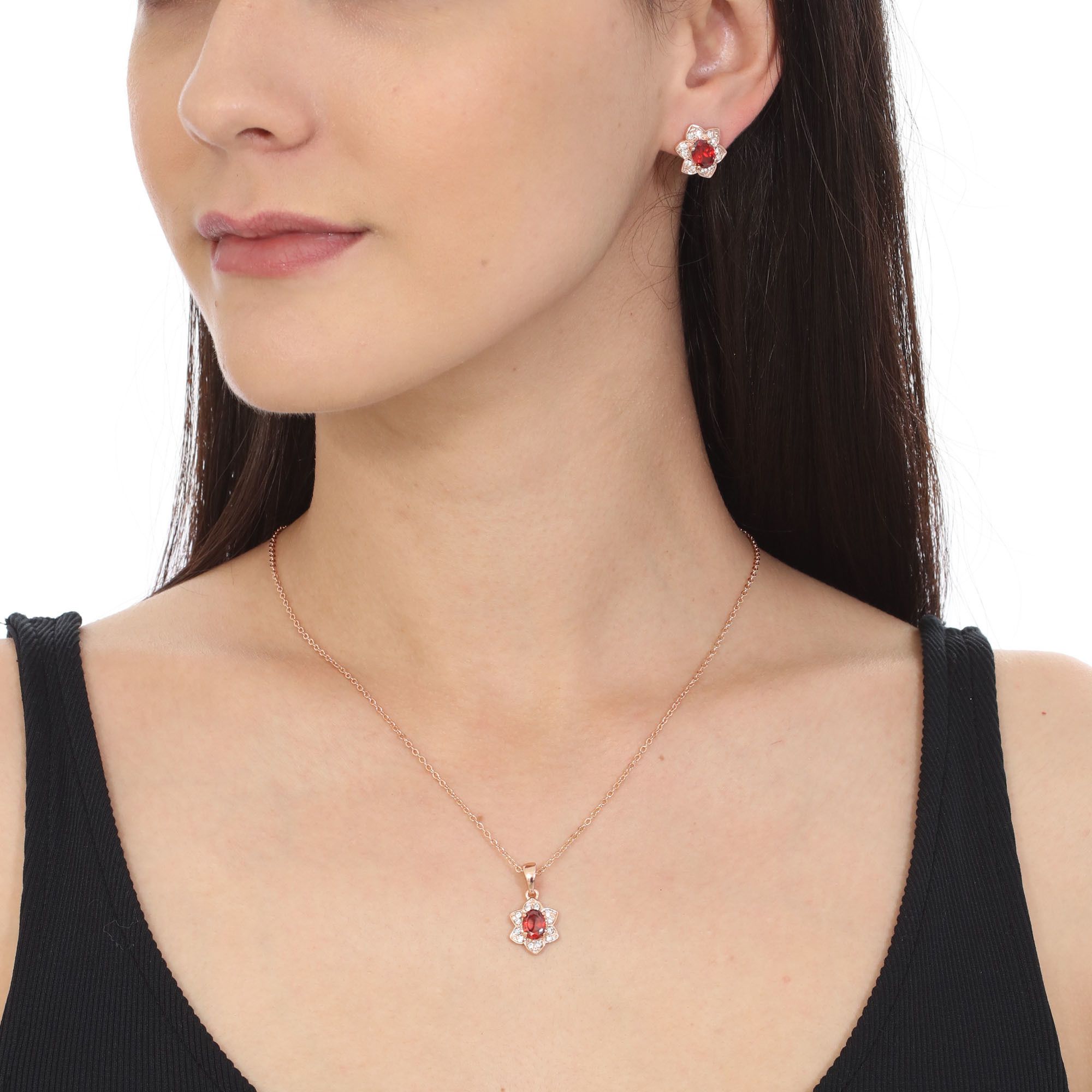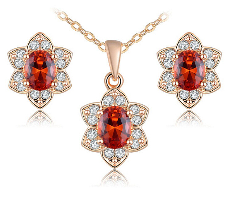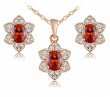 Juego de aretes y dije con cadena en baño de oro rosa de 18 quilates, fino diseño de flor, con cristales anaranjados corte oval e incrustaciones de cristales en color blanco. Fabricado en una estructura de aleación de platino con rodio sin níquel.