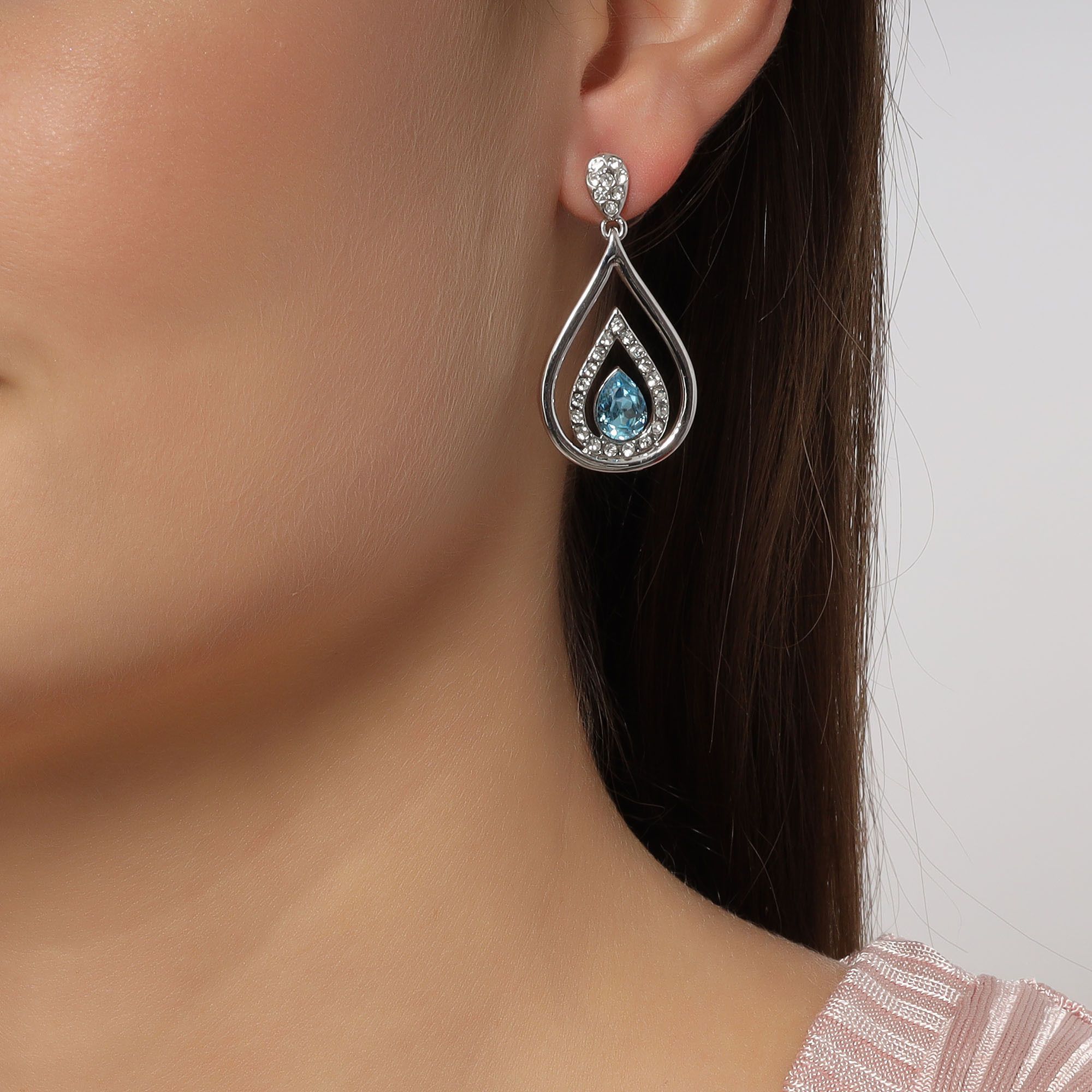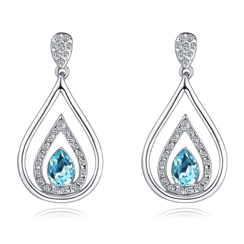 Hermosos aretes en baño de oro blanco de 18 quilates, diseño de gota con incrustaciones de cristales en color azul turqueza y blanco. Fabricado en una estructura de aleación de platino con rodio sin níquel.