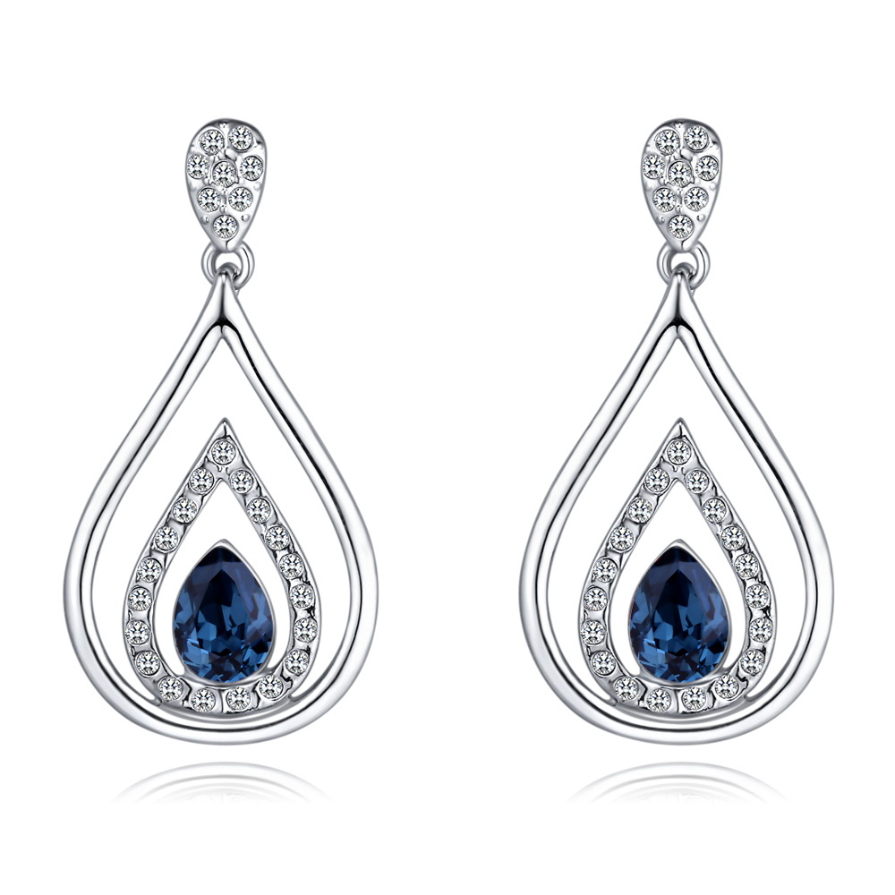 Hermosos aretes en baño de oro blanco de 18 quilates, diseño de gota con incrustaciones de cristales en color azul marino y blanco. Fabricado en una estructura de aleación de platino con rodio sin níquel.