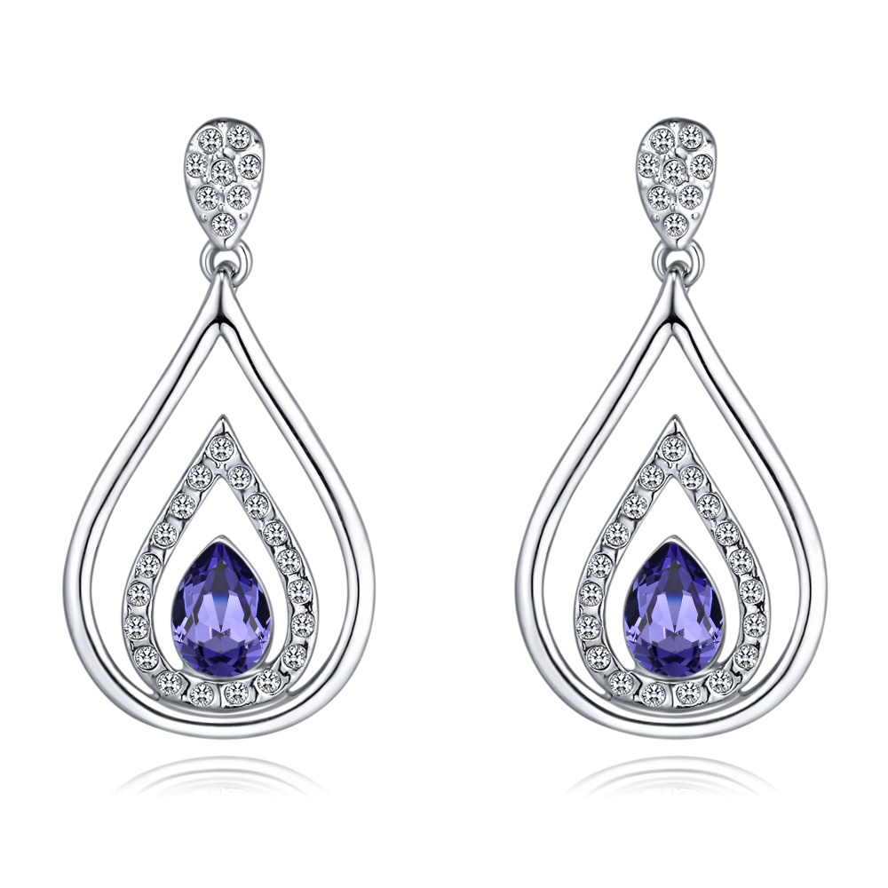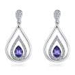 Hermosos aretes en baño de oro blanco de 18 quilates, diseño de gota con incrustaciones de cristales en color blanco y morado. Fabricado en una estructura de aleación de platino con rodio sin níquel.