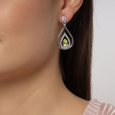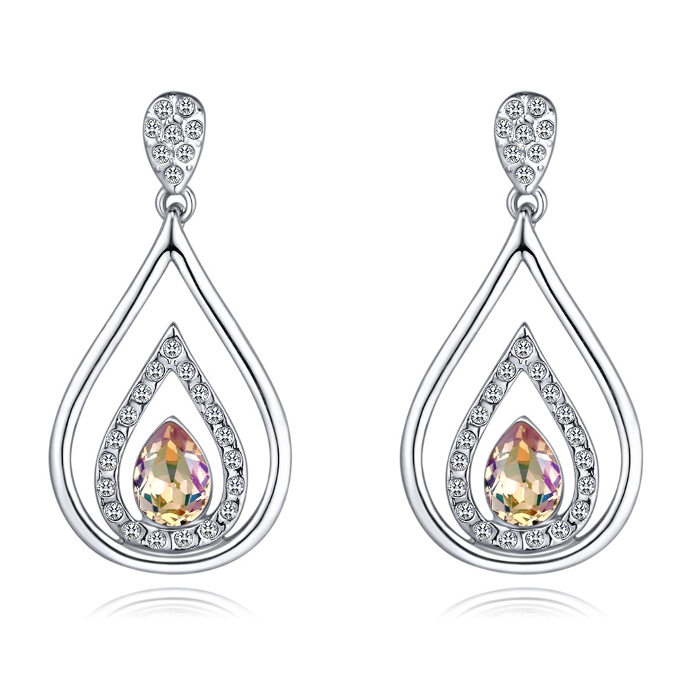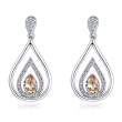 Hermosos aretes en baño de oro blanco de 18 quilates, diseño de gota con incrustaciones de cristales en color ambar y blanco. Fabricado en una estructura de aleación de platino con rodio sin níquel.