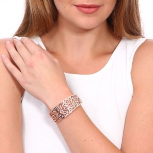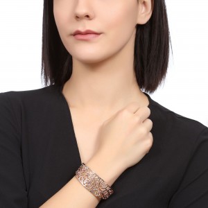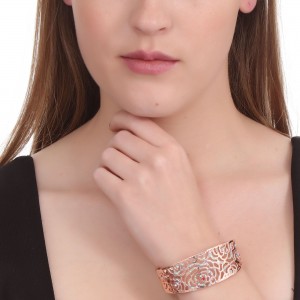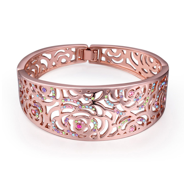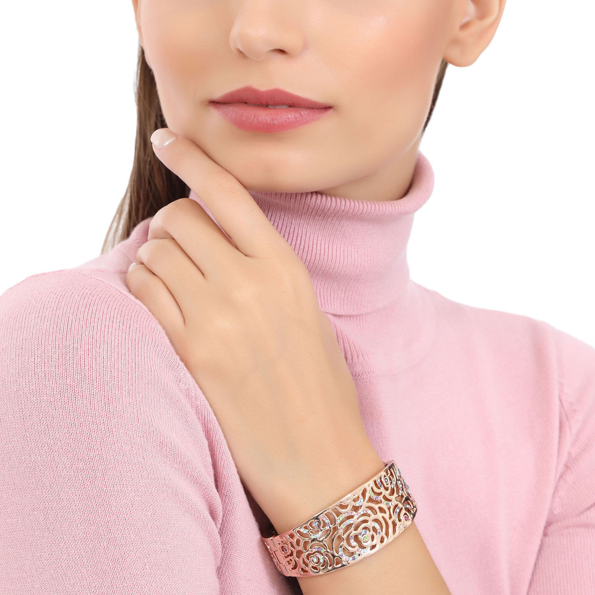 Brazalete en baño de oro rosa de 18 quilates, diseño de rosas caladas con incrustaciones de cristales en colores. Fabricado en una estructura de aleación de platino con rodio sin níquel.