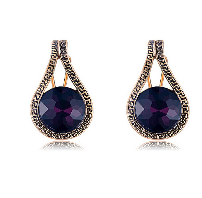Aretes en baño de oro rosa de 18 quilates, acabado antiguo con grecas e incrustación de cristal en color morado. Fabricado en una estructura de aleación de platino con rodio sin níquel.