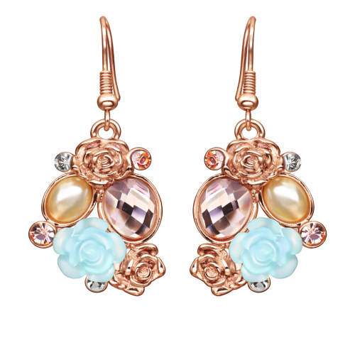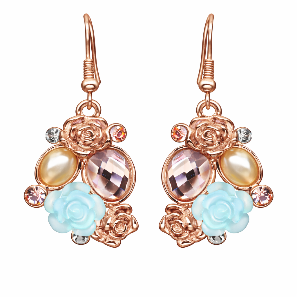 Aretes en baño de oro rosa de 18 quilates con rosa de cristal color celeste, rosas, cristales ámbar, detalle de perla e incrustaciones de cristales blancos. Fabricado en una estructura de aleación de platino con rodio sin níquel.