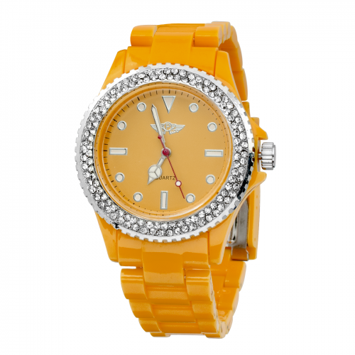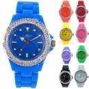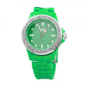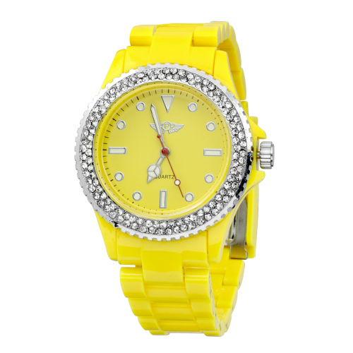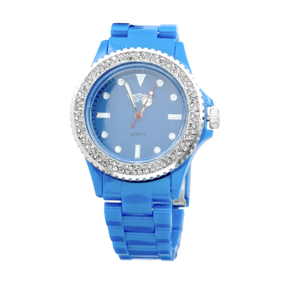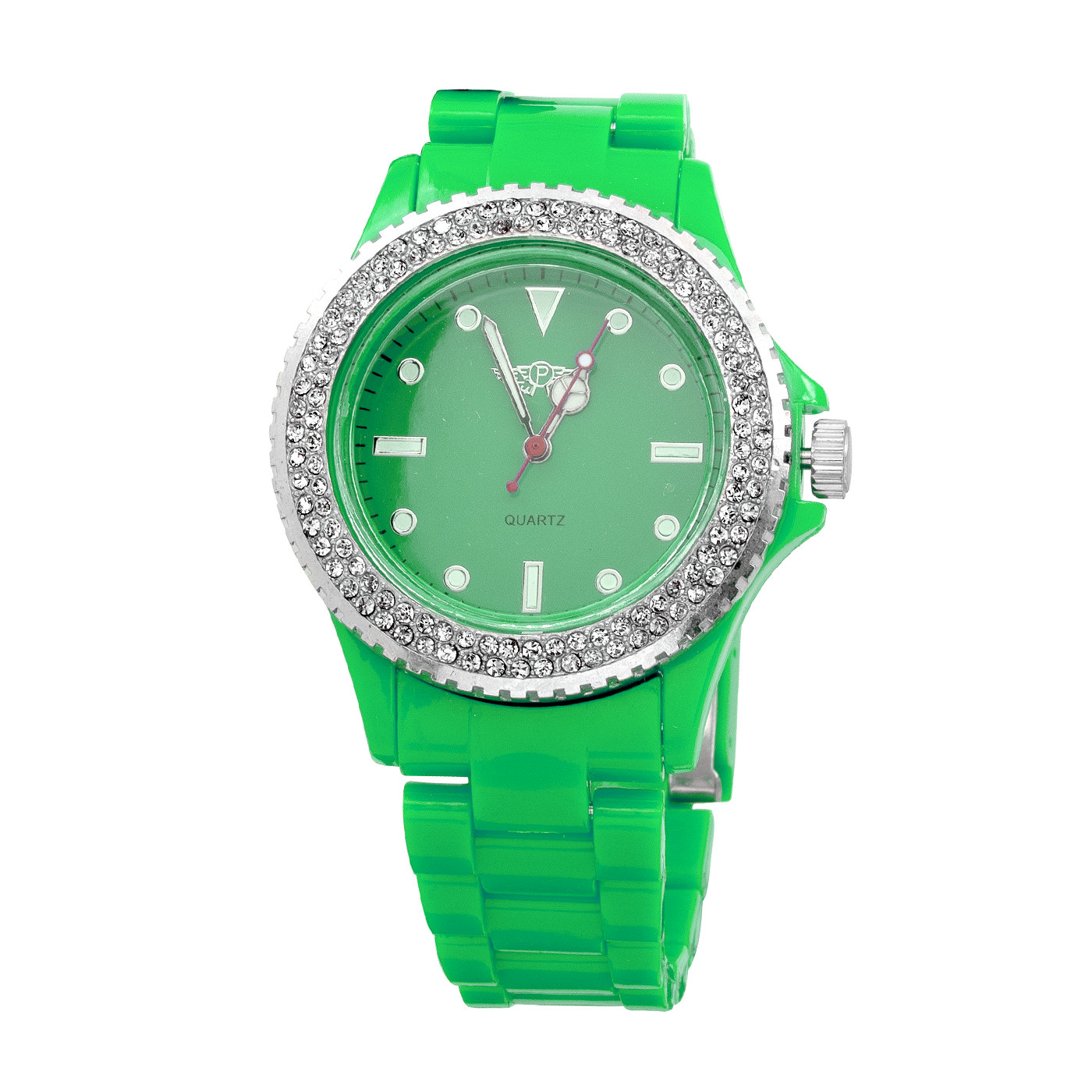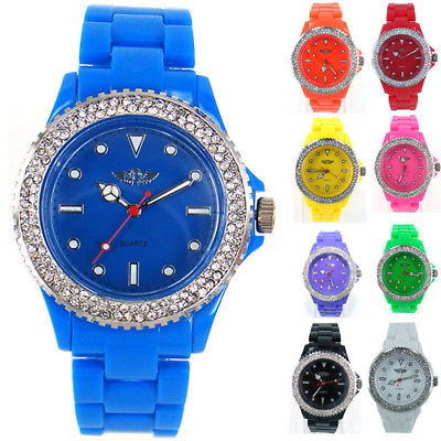 Hermoso Reloj NY con incrustaciones de cristales blancos , correa de plástico, disponible en colores: Negro, Azul, Naranja Rojo, Amarillo, Morado, Verde y Blanco. Fabricado en una estructura de aleación de platino con rodio sin níquel.