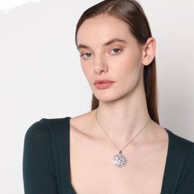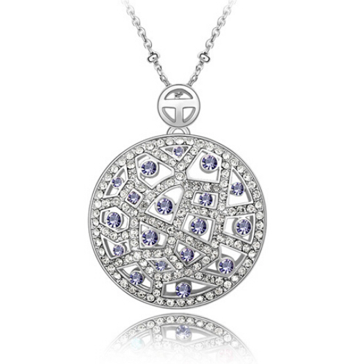 Precioso dije en baño de oro blanco de 18 quilates, diseño de circulo calado con incrustaciones de cristales en color blanco y lila. Fabricado en una estructura de aleación de platino con rodio sin níquel.
