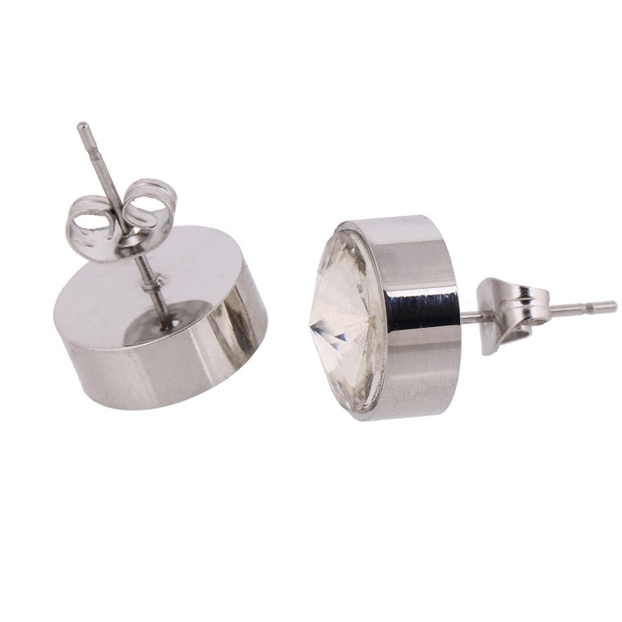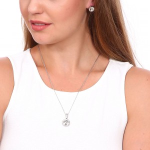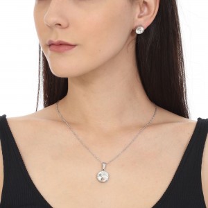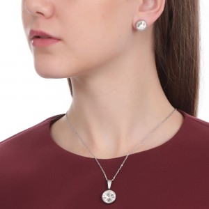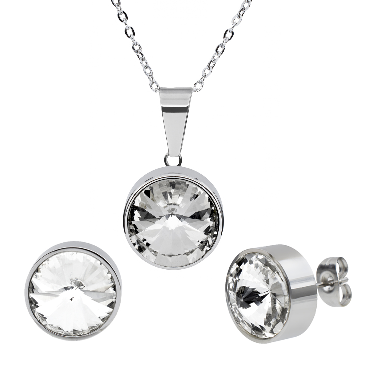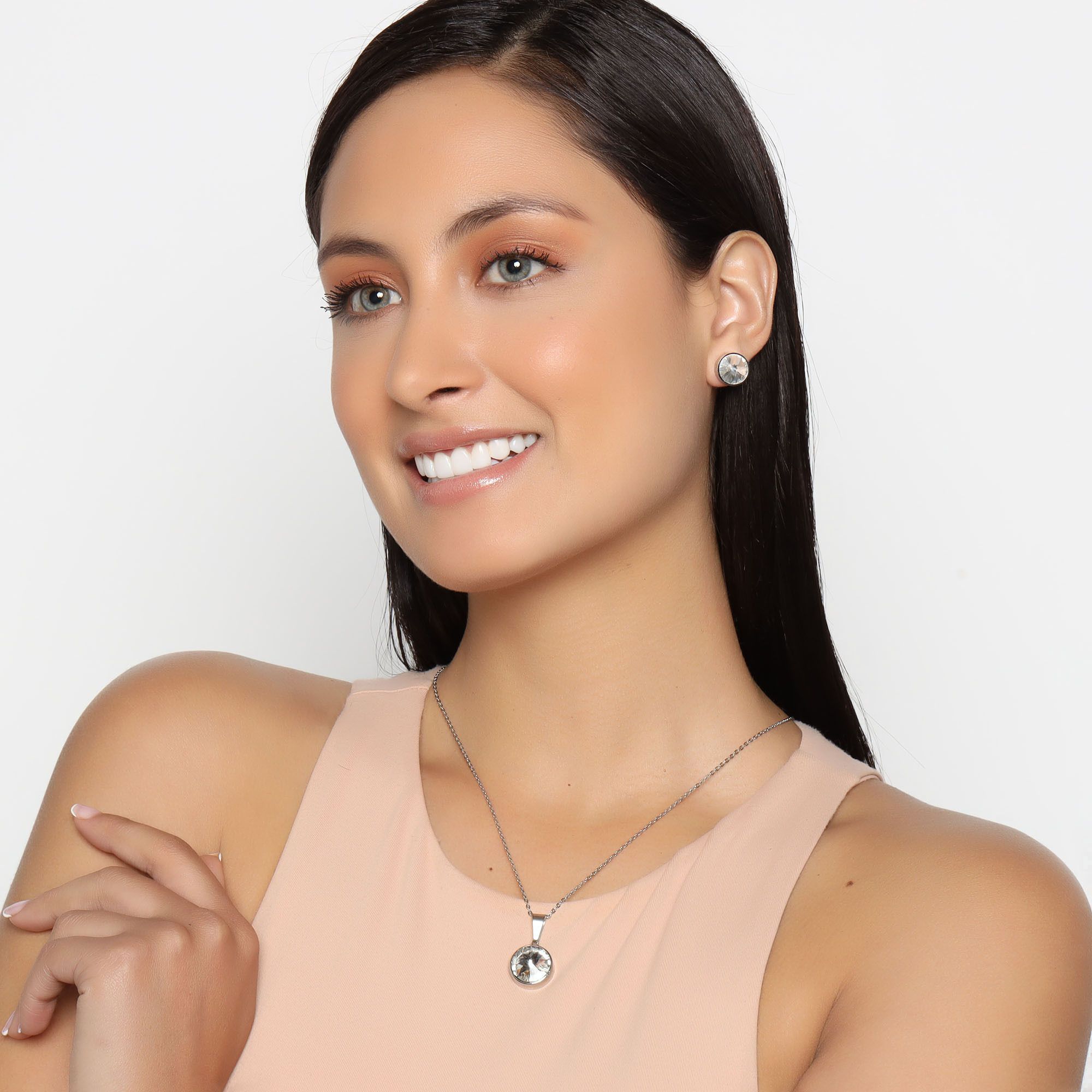 Juego de aretes y dije con cadena de acero inoxidable, con cristales blancos corte brillante.