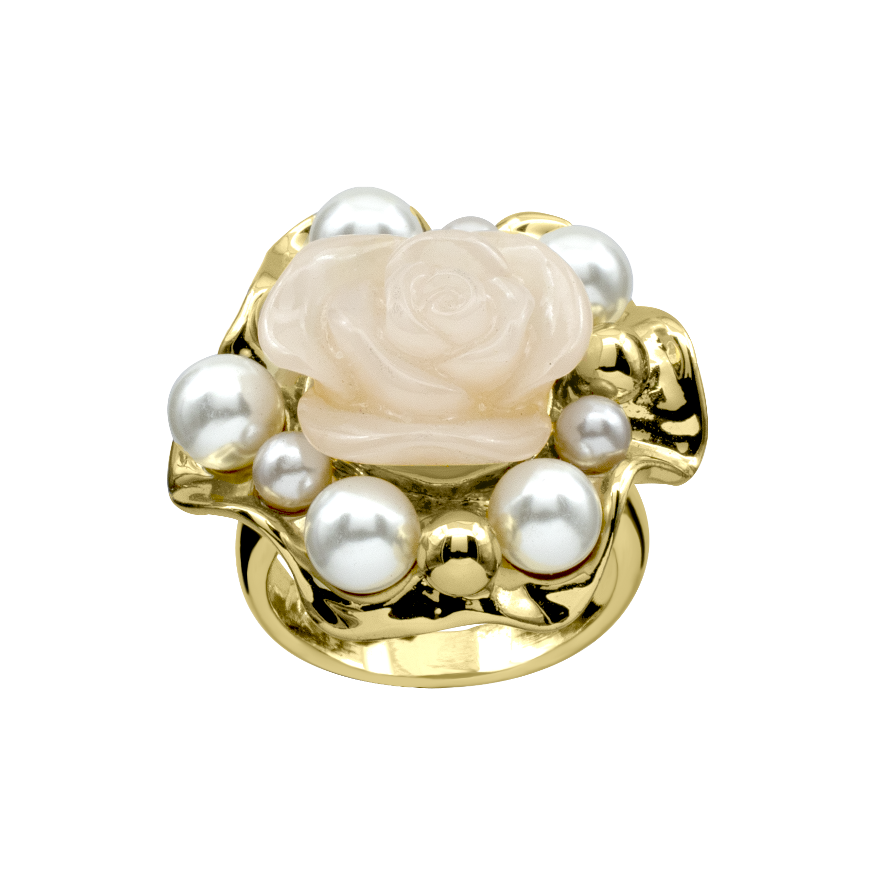 Fino anillo, en baño de oro amarillo de 18 quilates, con rosa de cristal color melón opaco y perlas color blanco y ivory. Fabricado en una estructura de aleación de platino con rodio sin níquel.