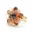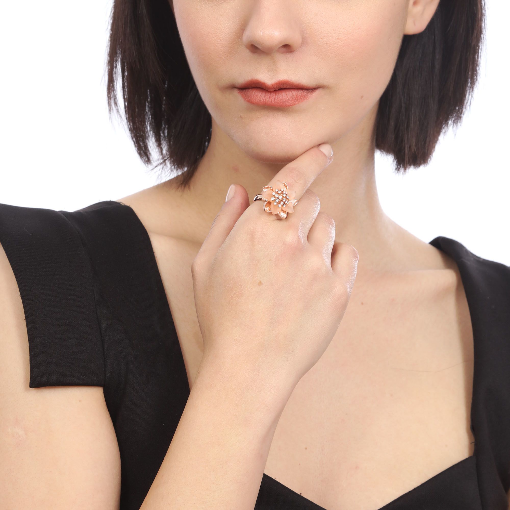 Moderno anillo en baño de oro rosa de 18 quilates, con flor de cristal opaco color durazno e incrustaciones de delicados cristales blancos.