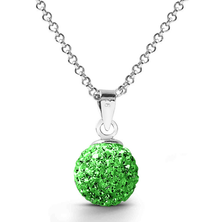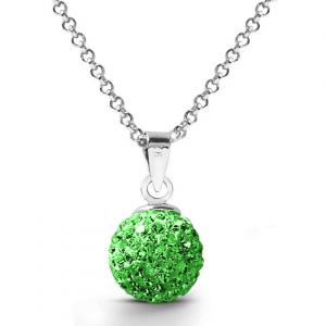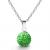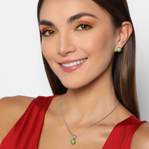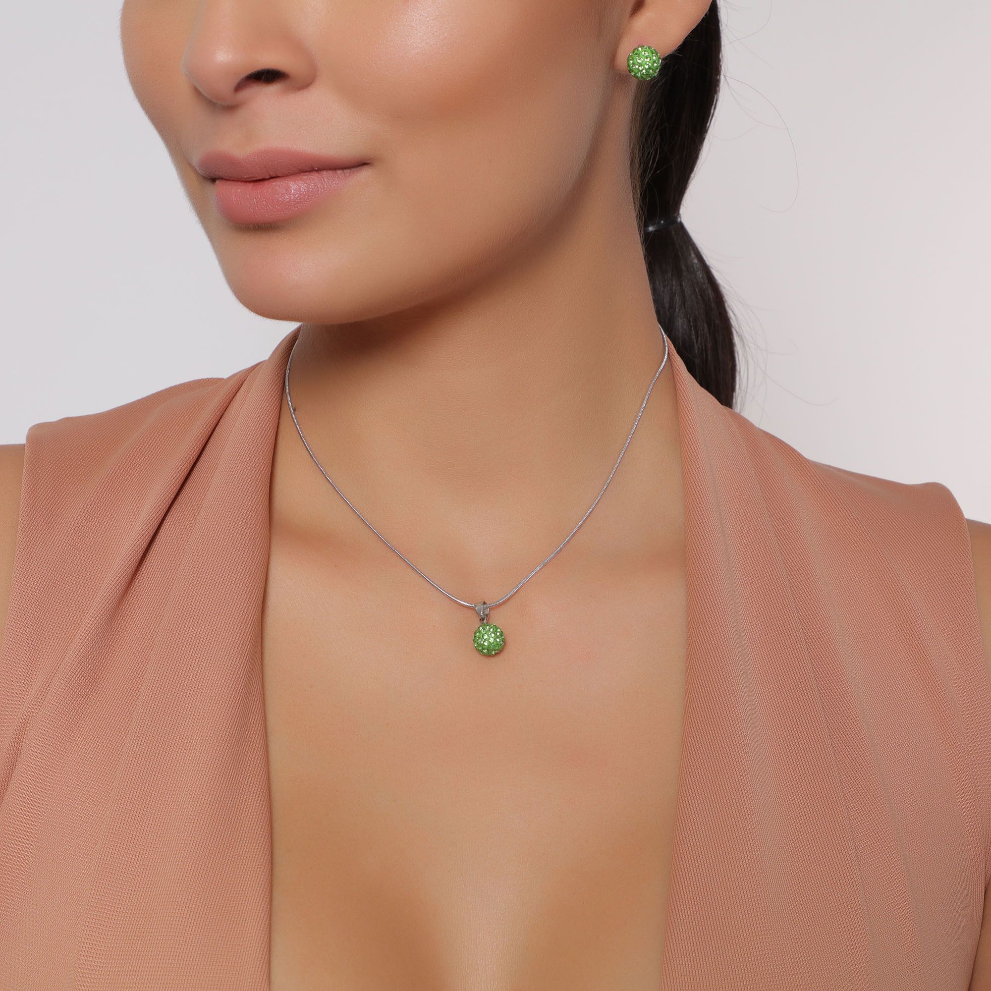 Juego de aretes y dije en baño de oro blanco de 18 quilates, diseño de esfera con incrustaciones de cristales en color verde. Fabricado en una estructura de aleación de platino con rodio sin níquel.