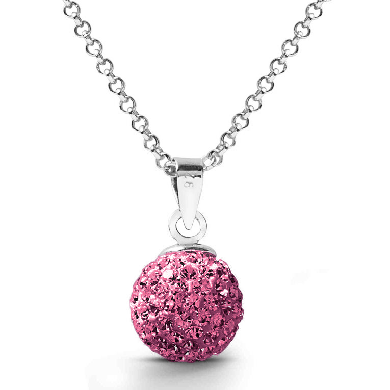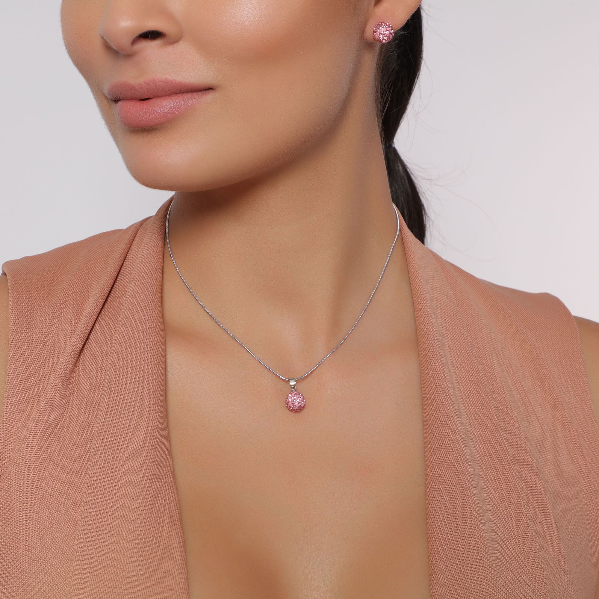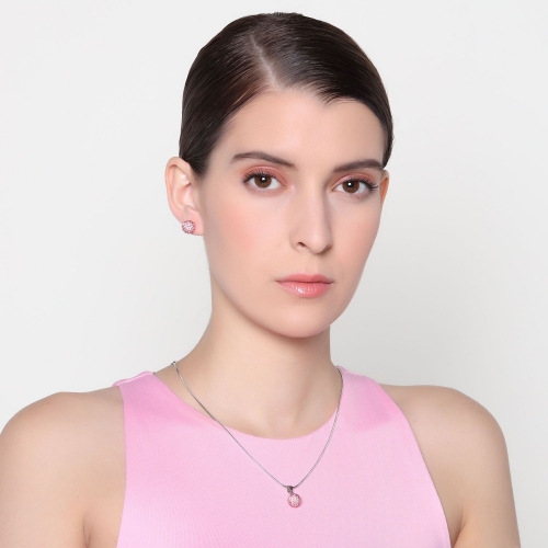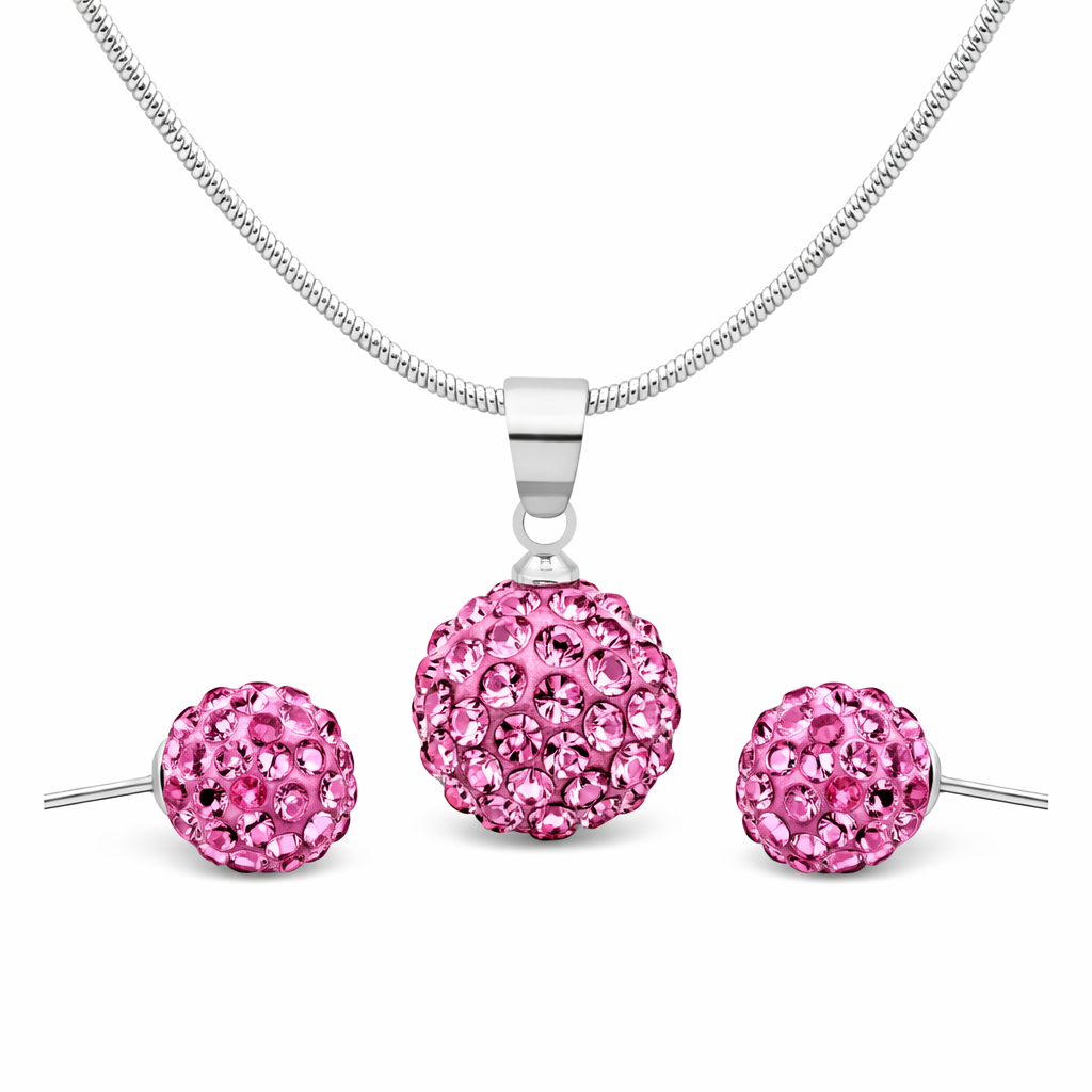 Juego de aretes y dije en baño de oro blanco de 18 quilates, diseño de esfera con incrustaciones de cristales en color rosa. Fabricado en una estructura de aleación de platino con rodio sin níquel.