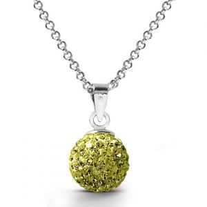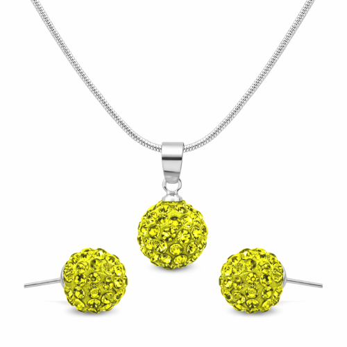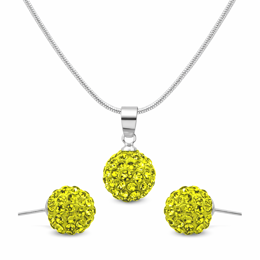 Juego de aretes y dije en baño de oro blanco de 18 quilates, diseño de esfera con incrustaciones de cristales en color amarillo. Fabricado en una estructura de aleación de platino con rodio sin níquel.
