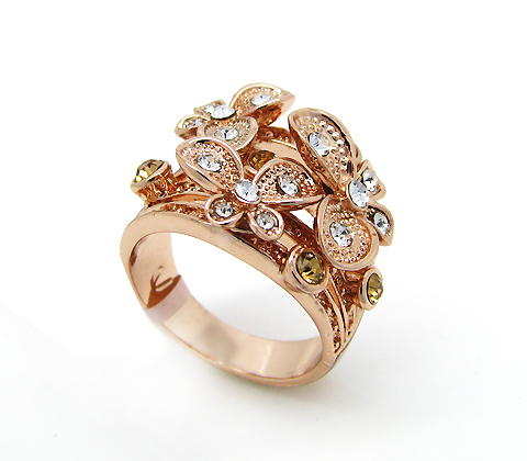 Bonito anillo en baño de oro rosa de 18 quilates, detalle de mariposas con incrustaciones de cristales olivo y blanco. Fabricado en una estructura de aleación de platino con rodio sin níquel.