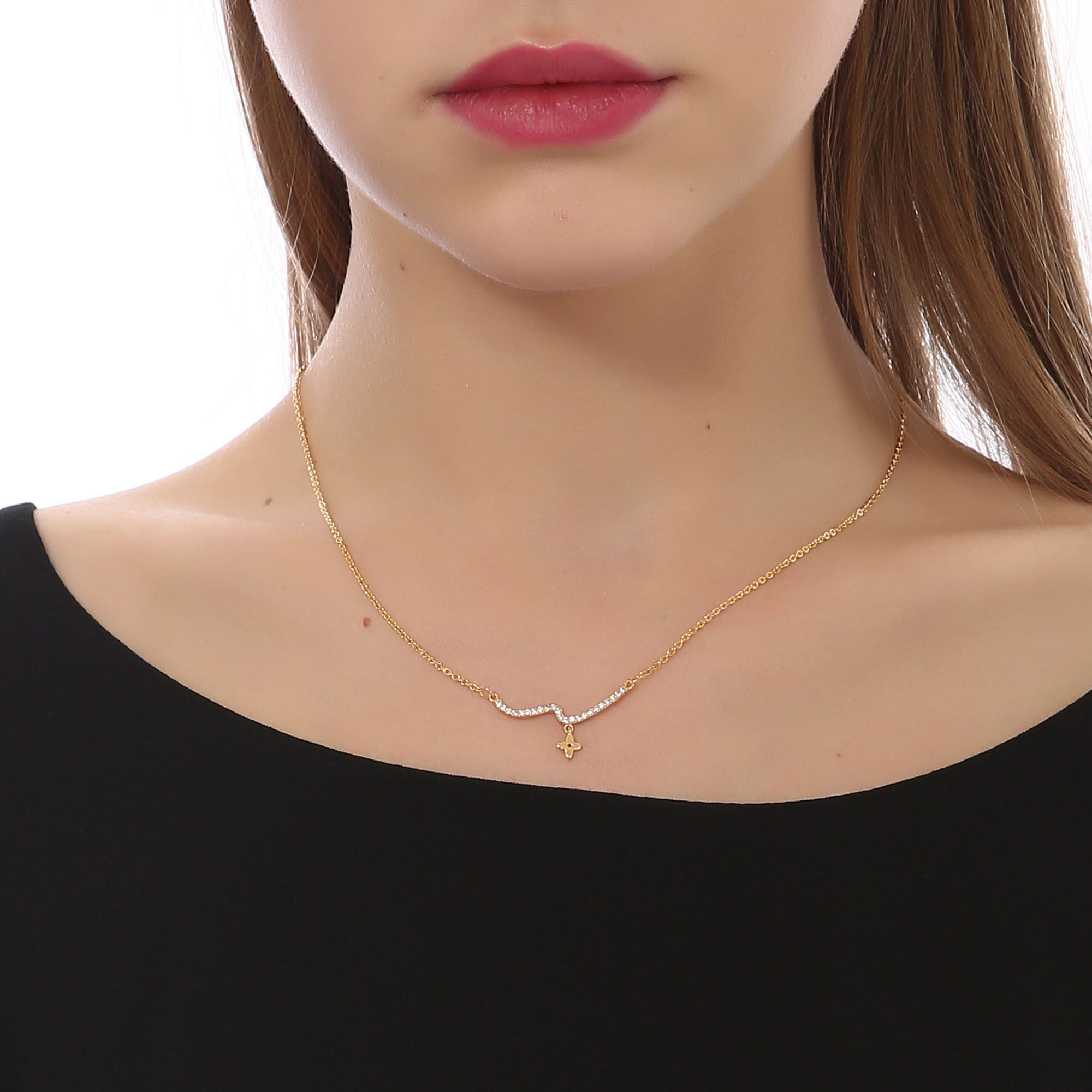 Collar en baño de oro amarillo de 18 quilates, diseño con flor dorada e incrustaciones de cristales en color blanco. Fabricado en una estructura de aleación de platino con rodio sin níquel.