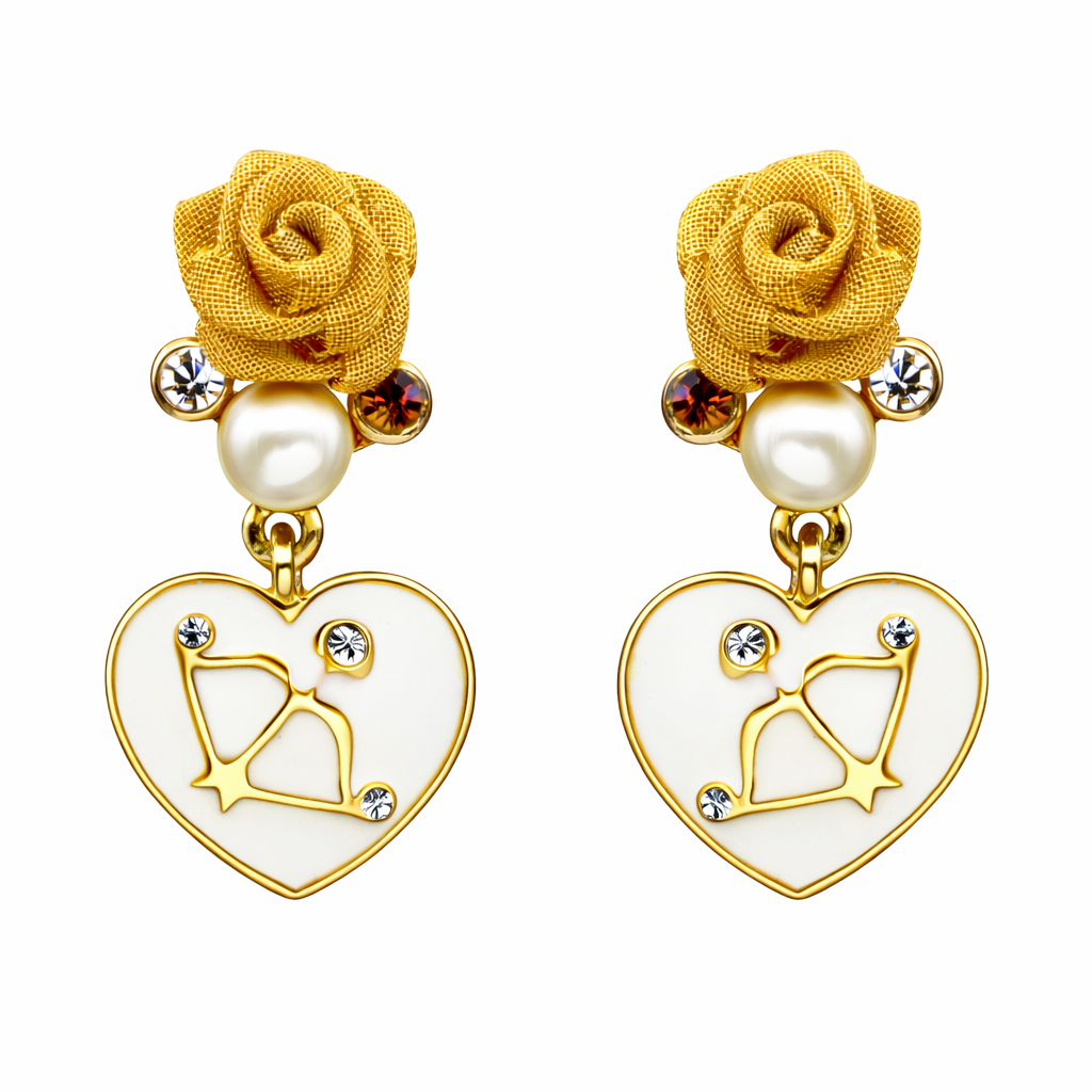 Hermosos pendientes en baño de oro amarillo de 18 quilates, detalle de rosa dorada con perla, corazón esmaltado color blanco e incrustaciones de cristales en color blanco y ámbar. Fabricado en una estructura de aleación de platino con rodio sin níquel.