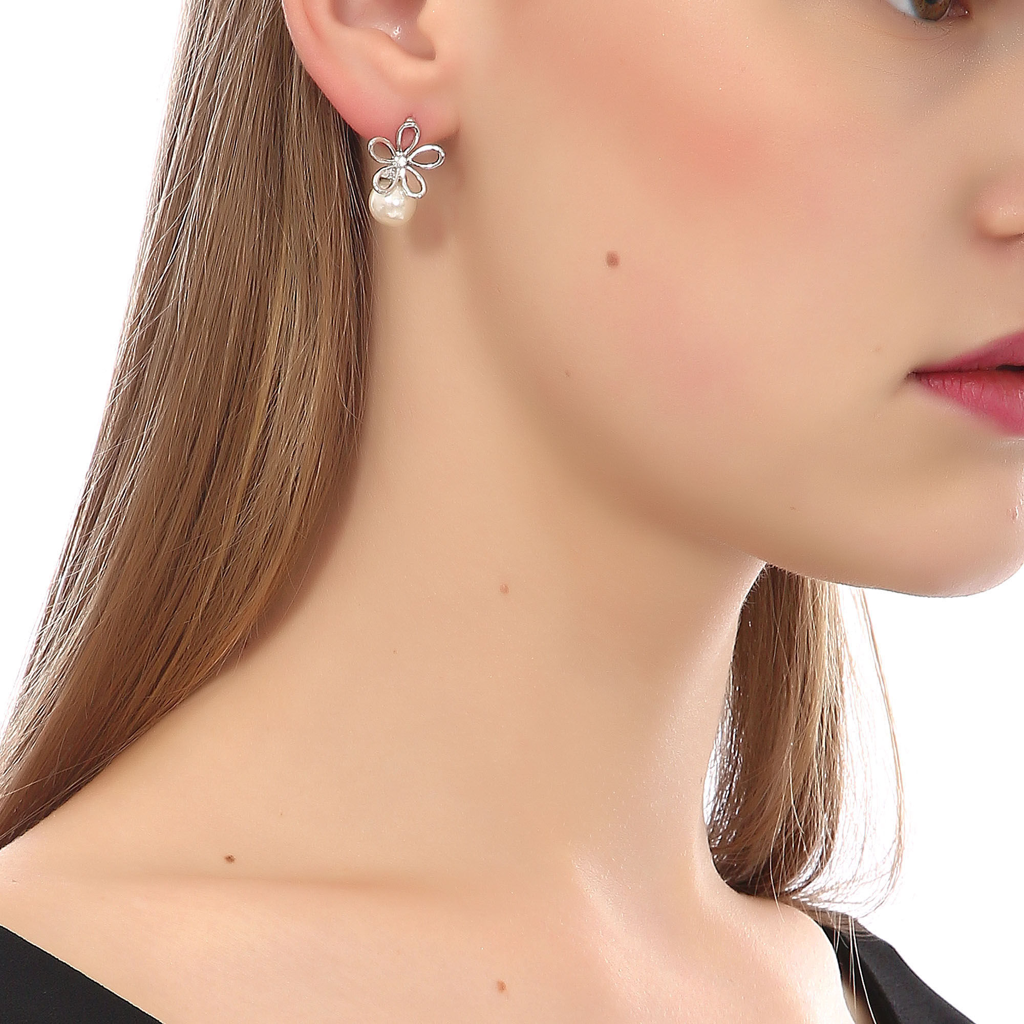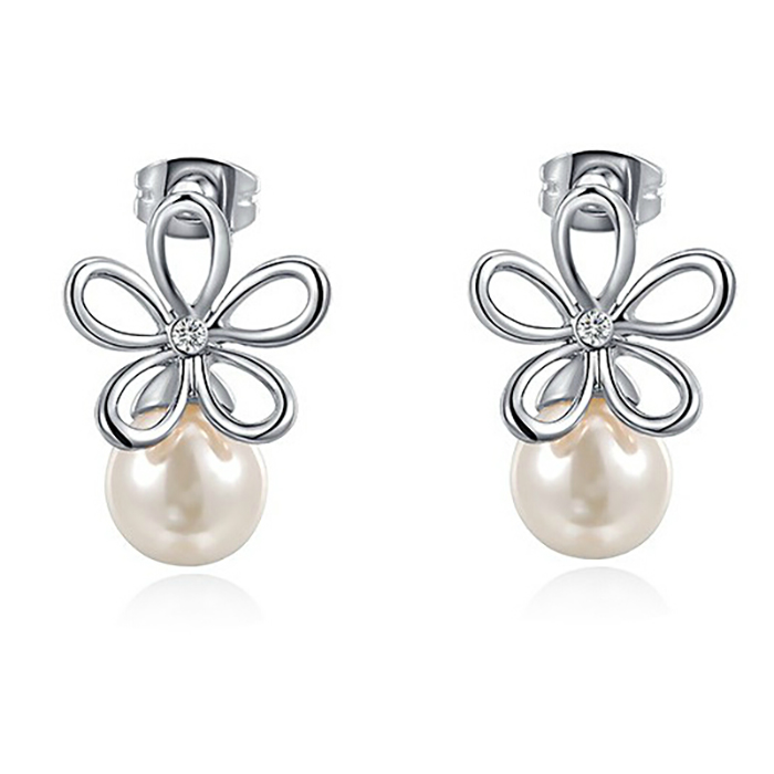 Lindos aretes en baño de oro blanco de 18 quilates, diseño de flor con detalle de perla blanca e incrustación de cristal en color blanco. Fabricado en una estructura de aleación de platino con rodio sin níquel.