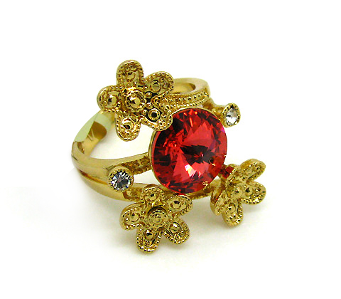 Elegante anillo en baño de oro amarillo de 18 quilates, con cristales rojos, diseño de flores e incrustaciones de cristales blancos. Fabricado en una estructura de aleación de platino con rodio sin níquel.