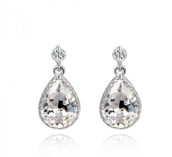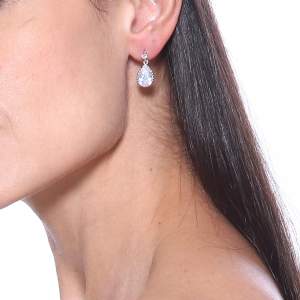 Hermosos aretes en baño de oro blanco de 18 quilates, diseño de gota con incrustaciones de cristales en color blanco. Fabricado en una estructura de aleación de platino con rodio sin níquel.