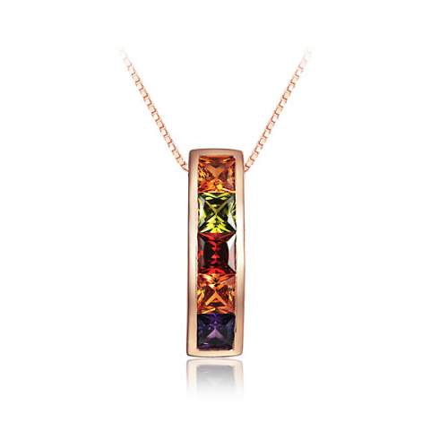 Dije con cadena en baño de oro rosa de 18 quilates, fino diseño con incrustaciones de cristales corte princesa en colores. Fabricado en una estructura de aleación de platino con rodio sin níquel.