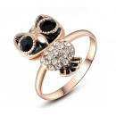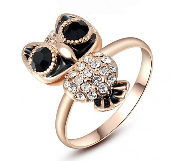 Tierno anillo en baño de oro rosa de 18 quilates , diseño de búho con esmaltado negro e incrustaciones de cristales en color blanco. Fabricado en una estructura de aleación de platino con rodio sin níquel.