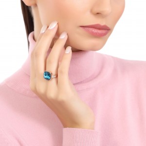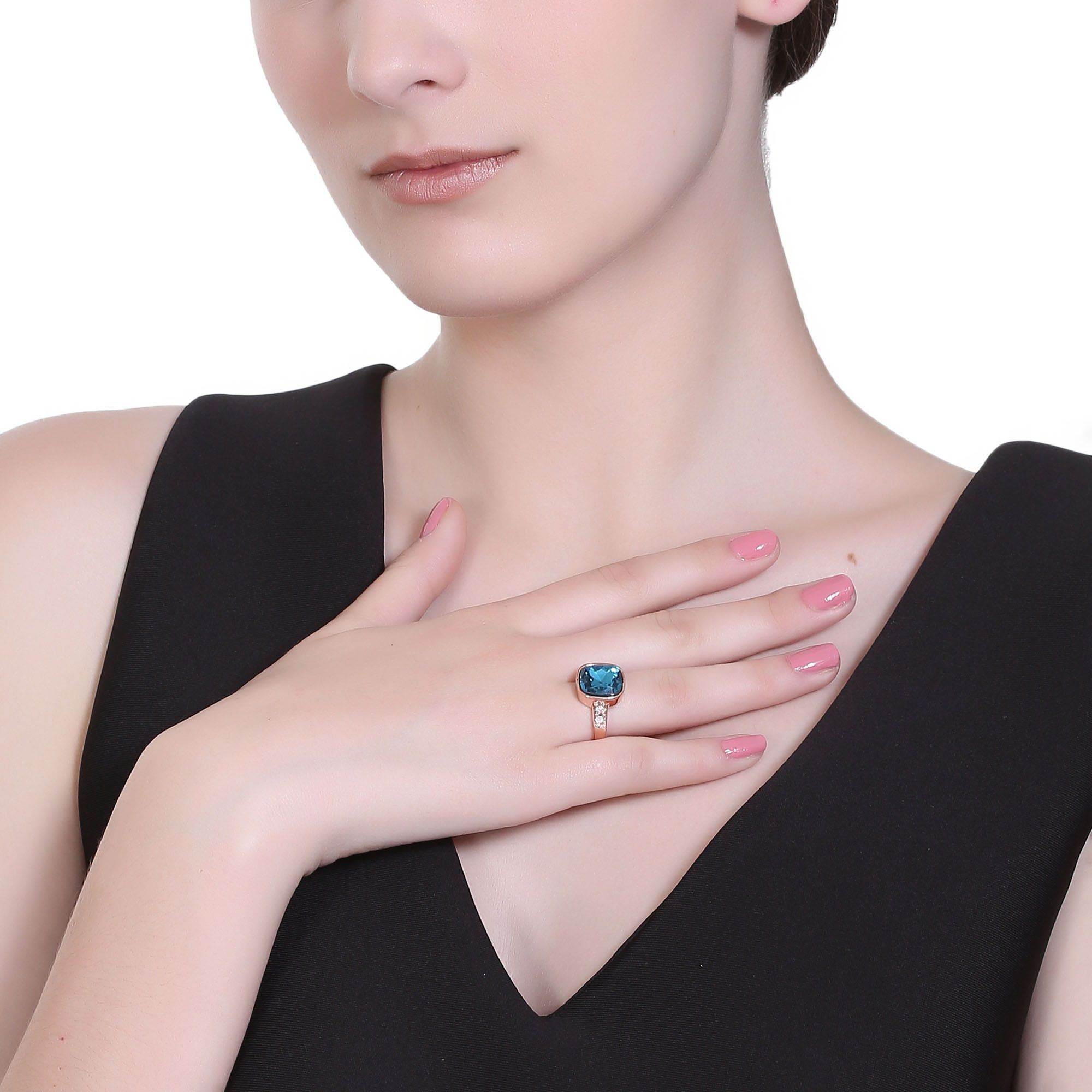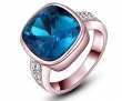Precioso anillo en baño de oro rosa de 18 quilates, fino diseño, con cristal azul corte cojín e incrustaciones de cristales blancos. Fabricado en una estructura de aleación de platino con rodio sin níquel.