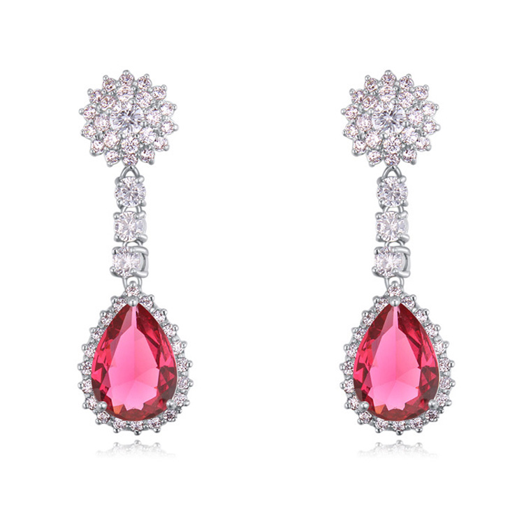 Hermosos aretes en baño de oro blanco de 18 quilates, fino diseño de gota con incrustaciones de cristales en color blanco y rosa. Fabricado en una estructura de aleación de platino con rodio sin níquel.