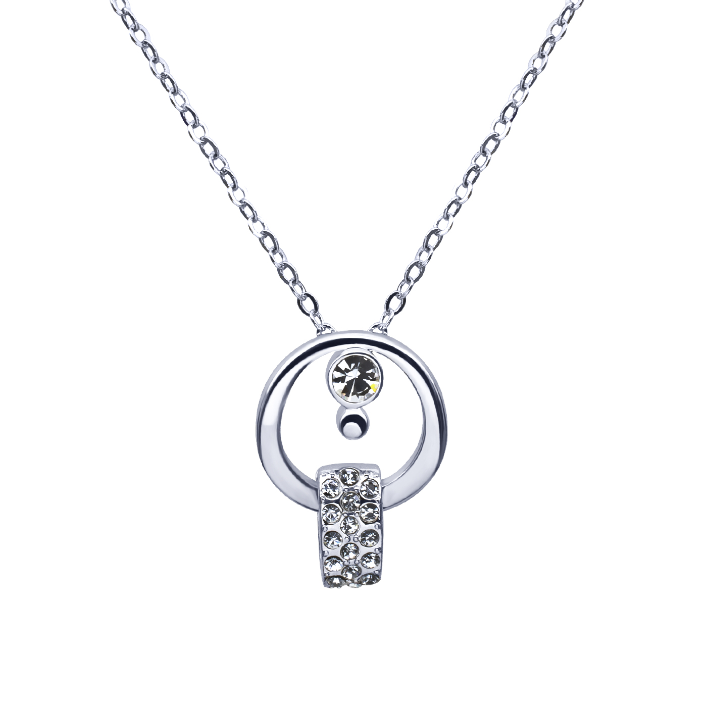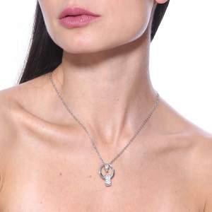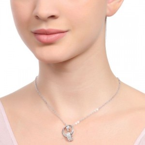 Lindo dije en baño de oro blanco de 18 quilates, diseño de aro y cilindro con incrustaciones de cristales en color blanco. Fabricado en una estructura de aleación de platino con rodio sin níquel.