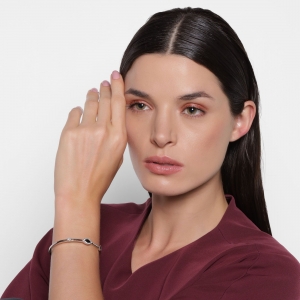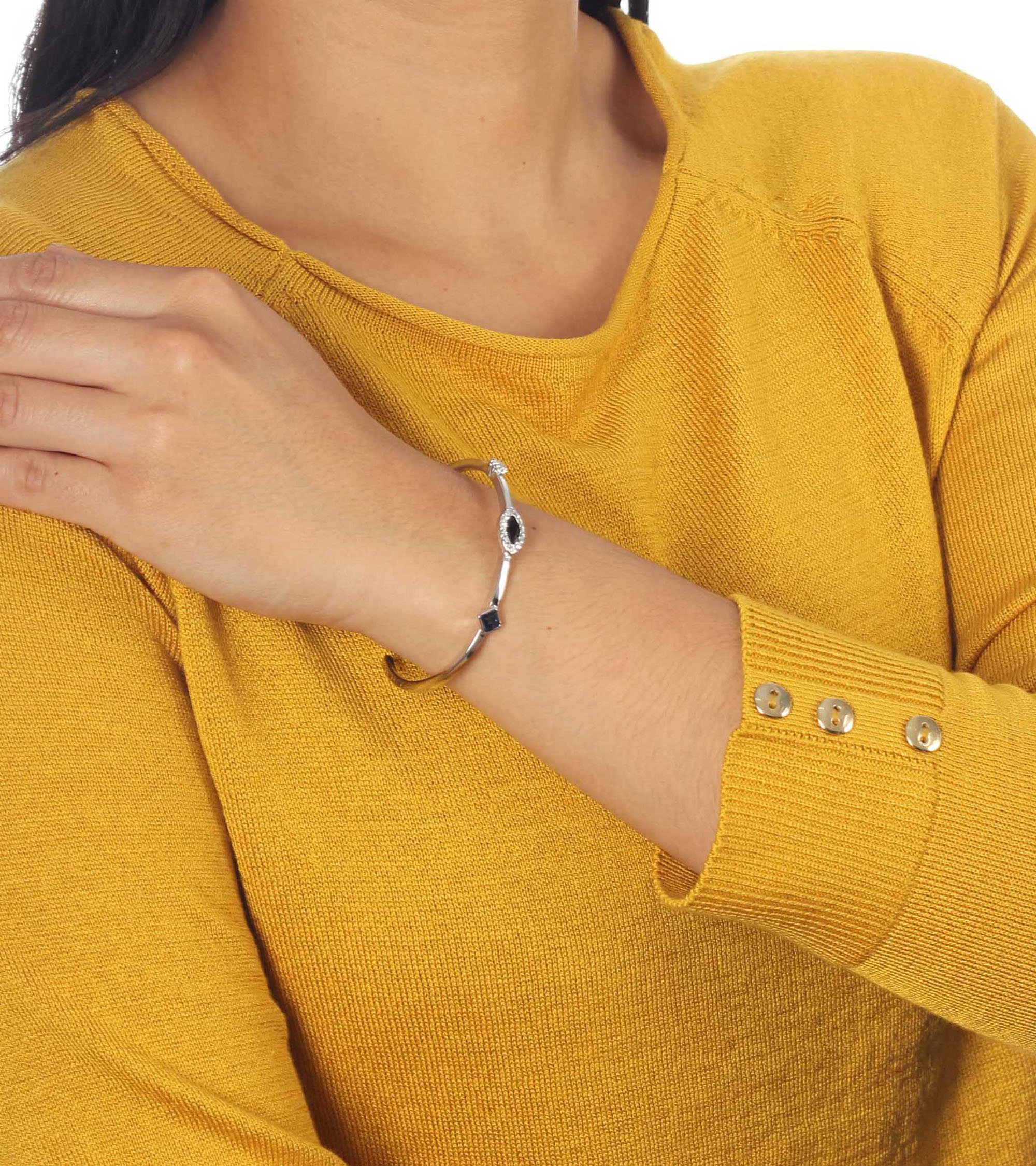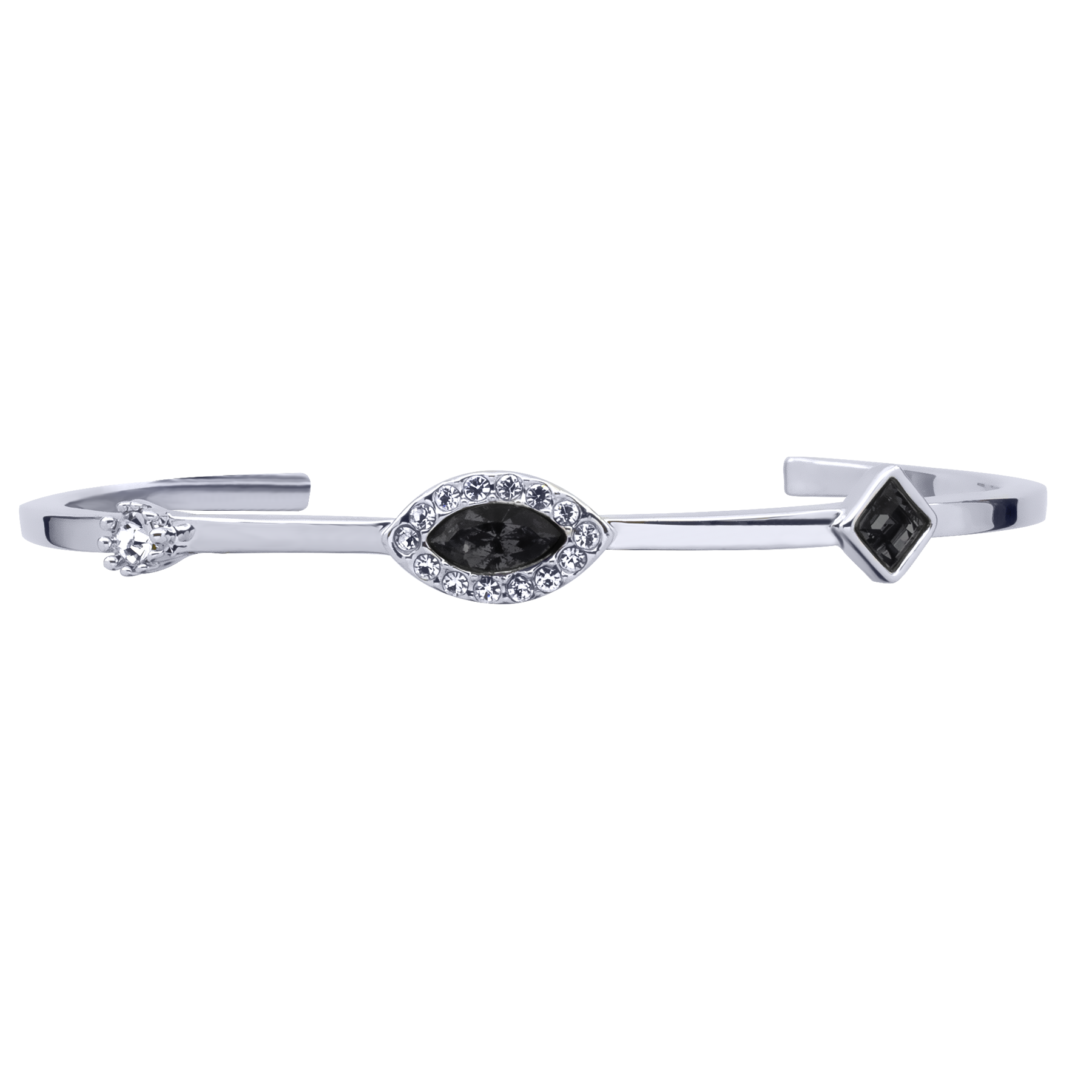 Lindo brazalete en baño de oro blanco de 18 quilates, diseño con cristal negro corte marquesa e incrustaciones de cristales en color azul, blanco. Fabricado en una estructura de aleación de platino con rodio sin níquel.