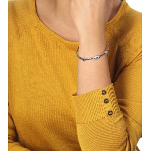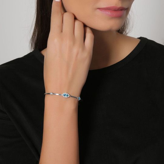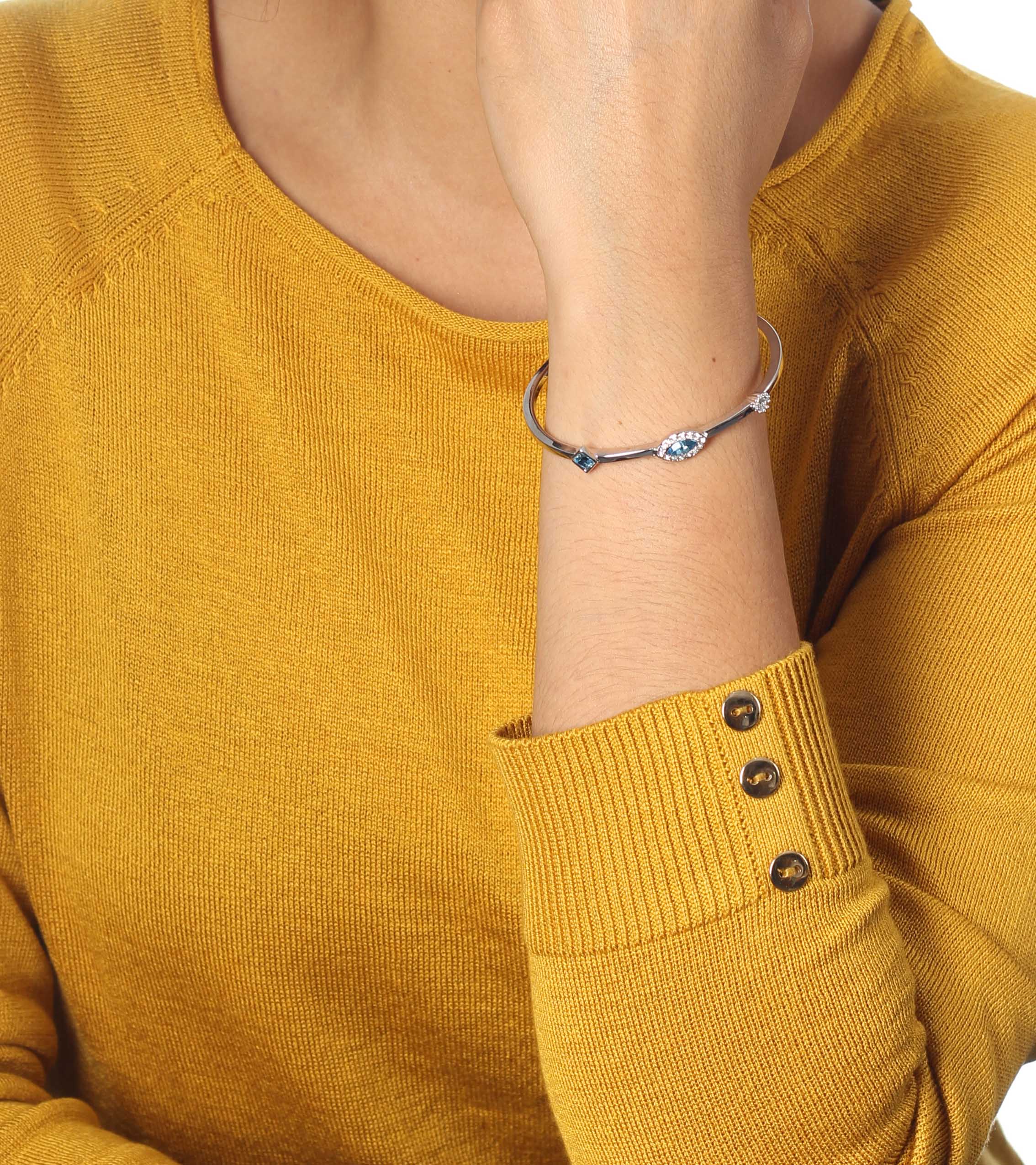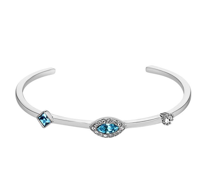Lindo brazalete en baño de oro blanco de 18 quilates, diseño con cristal azul corte marquesa e incrustaciones de cristales en color azul y blanco. Fabricado en una estructura de aleación de platino con rodio sin níquel.
