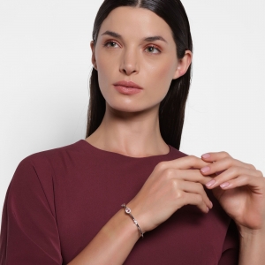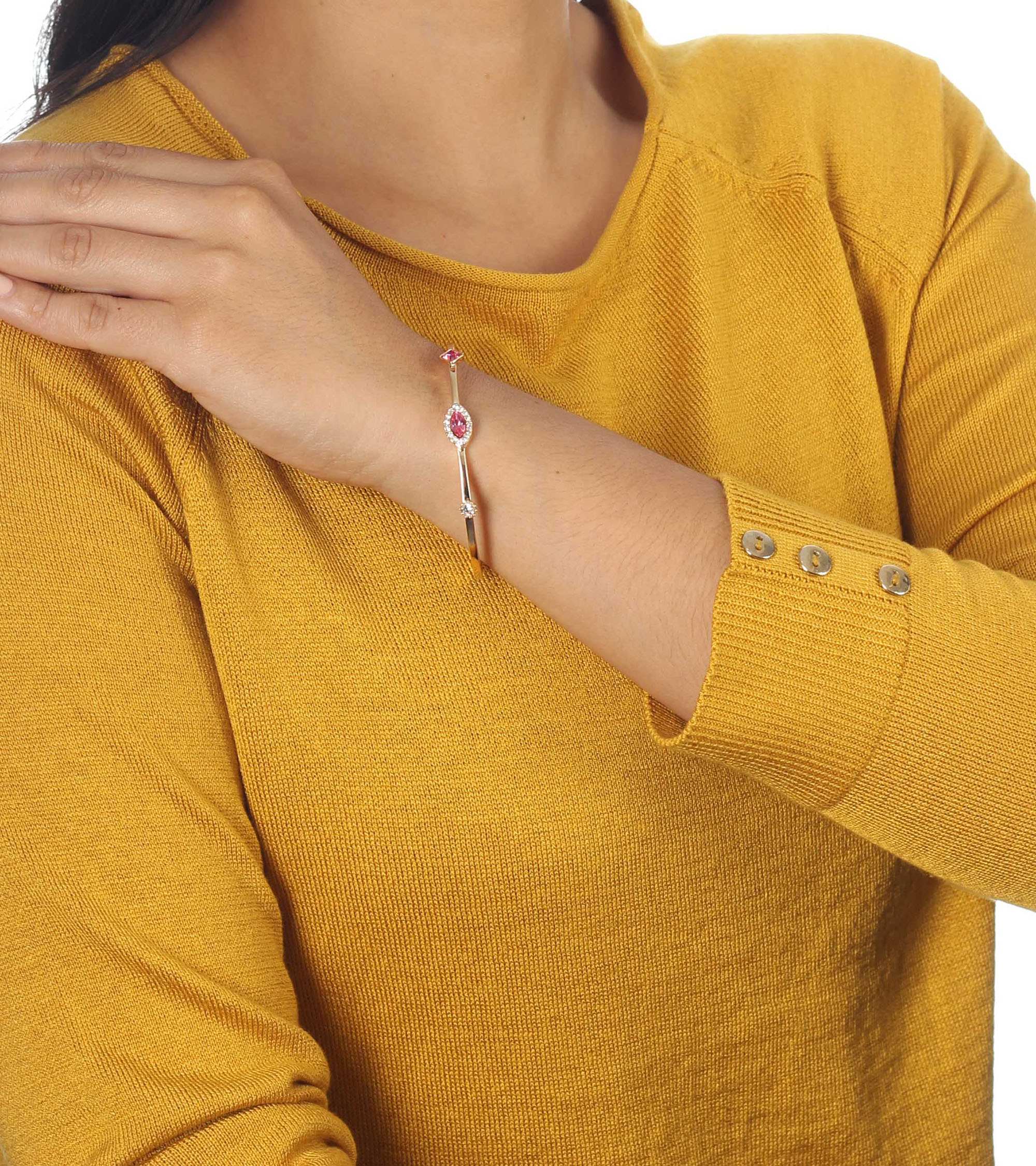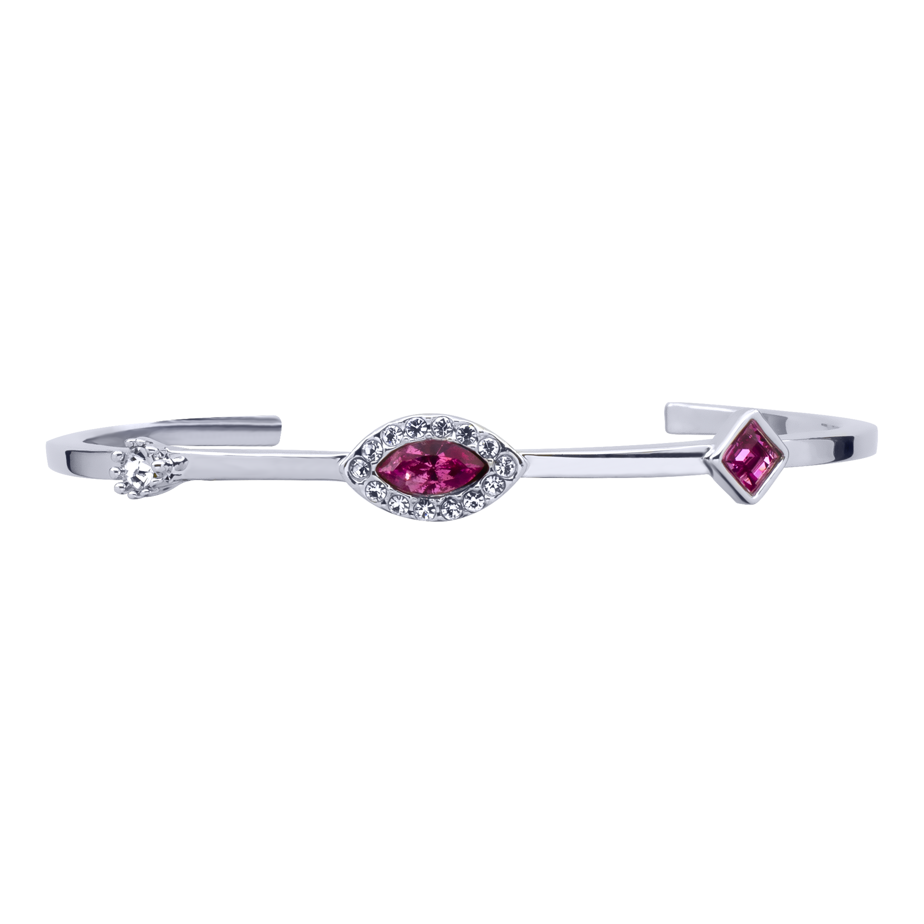 Lindo brazalete en baño de oro blanco de 18 quilates, diseño con cristal corte marquesa color rosa e incrustaciones de cristales en color rosa y blanco. Fabricado en una estructura de aleación de platino con rodio sin níquel.