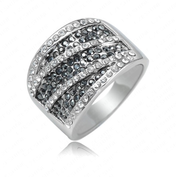 Precioso anillo en baño de oro blanco de 18 quilates, diseño de líneas en diagonal, con incrustaciones de cristales en color blanco y negro. Fabricado en una estructura de aleación de platino con rodio sin níquel.