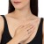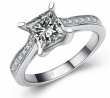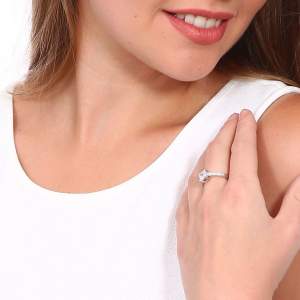 Delicado anillo en baño de oro blanco de 18 quilates ,fino diseño, con cristal blanco corte princesa e incrustaciones de cristales en color blanco. Fabricado en una estructura de aleación de platino con rodio sin níquel.