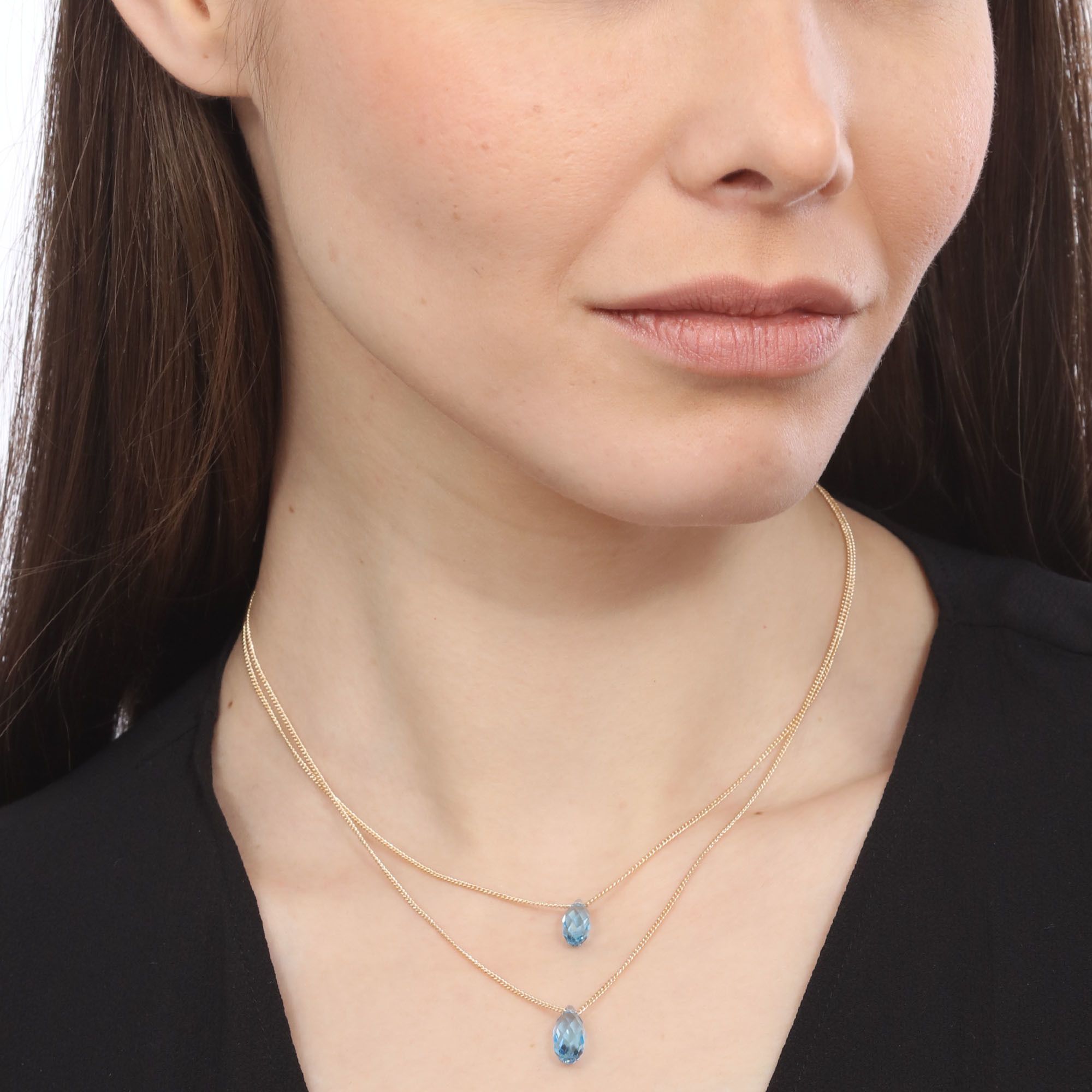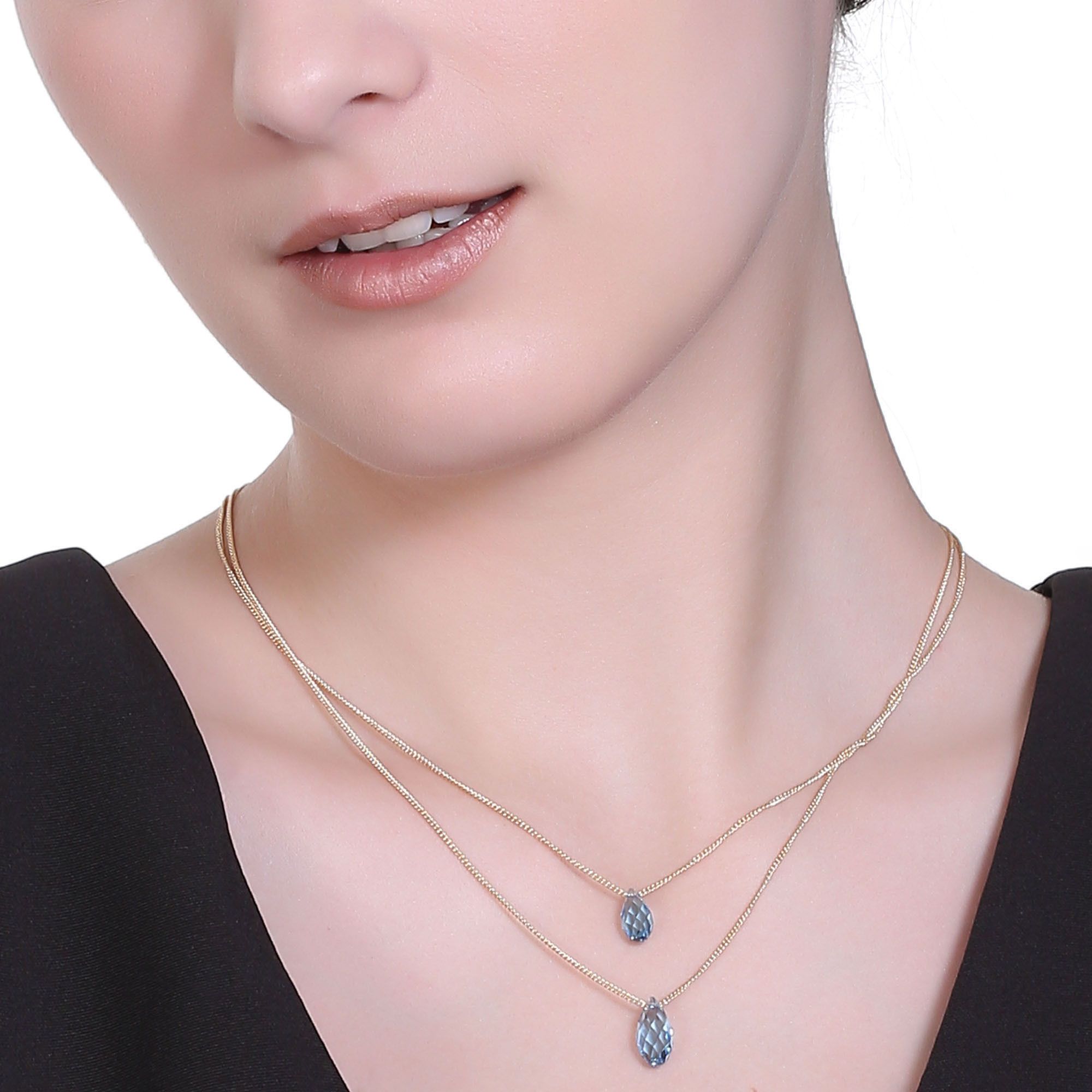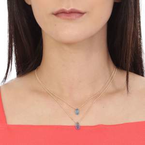 Precioso collar doble en baño de oro amarillo de 18 quilates, diseño de gota con incrustaciones de cristales en color azul. Fabricado en una estructura de aleación de platino con rodio sin níquel.