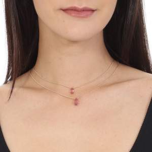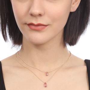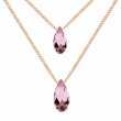 Precioso collar doble en baño de oro amarillo de 18 quilates, diseño de gota con incrustaciones de cristales en color lila. Fabricado en una estructura de aleación de platino con rodio sin níquel.