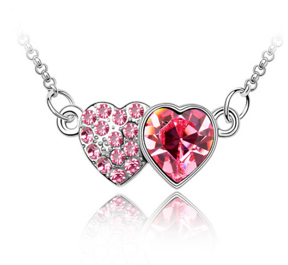 Collar en baño de oro blanco de 18 quilates, diseño de corazones unidos con incrustaciones de cristales en color rosa. Fabricado en una estructura de aleación de platino con rodio sin níquel.