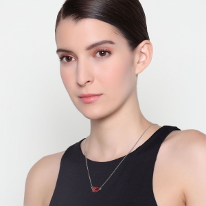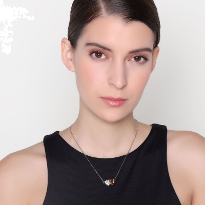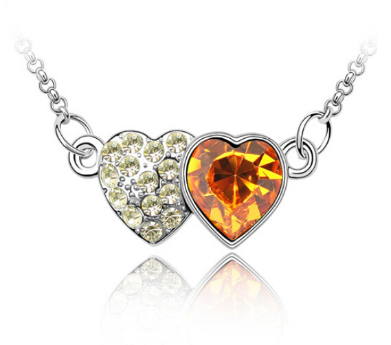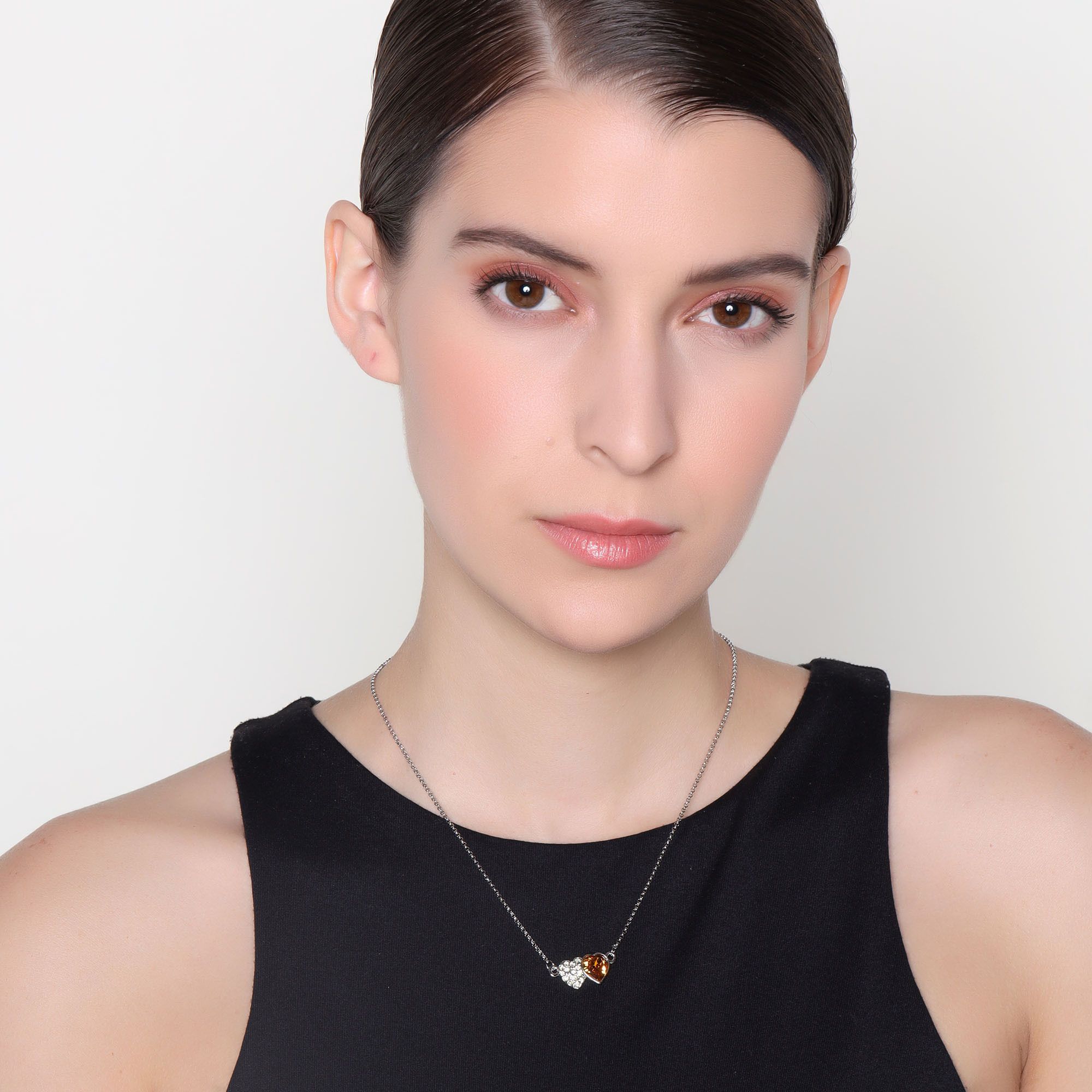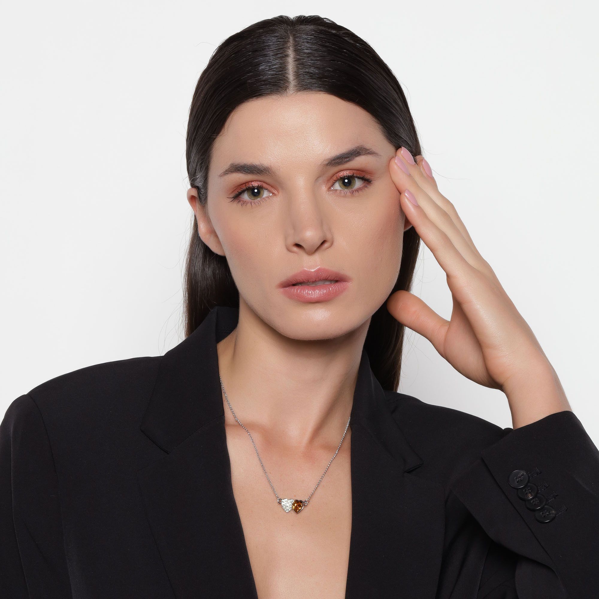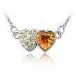 Collar en baño de oro blanco de 18 quilates, diseño de corazones unidos con incrustaciones de cristales en color amarillo. Fabricado en una estructura de aleación de platino con rodio sin níquel.