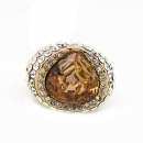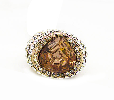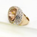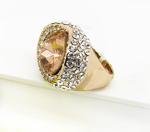 Bello anillo, en baño de oro rosa de 18 quilates, diseño oval, con cristal color ámbar corte pera e incrustaciones de cristales tonos ámbar y blanco. Fabricado en una estructura de aleación de platino con rodio sin níquel.