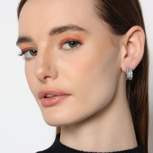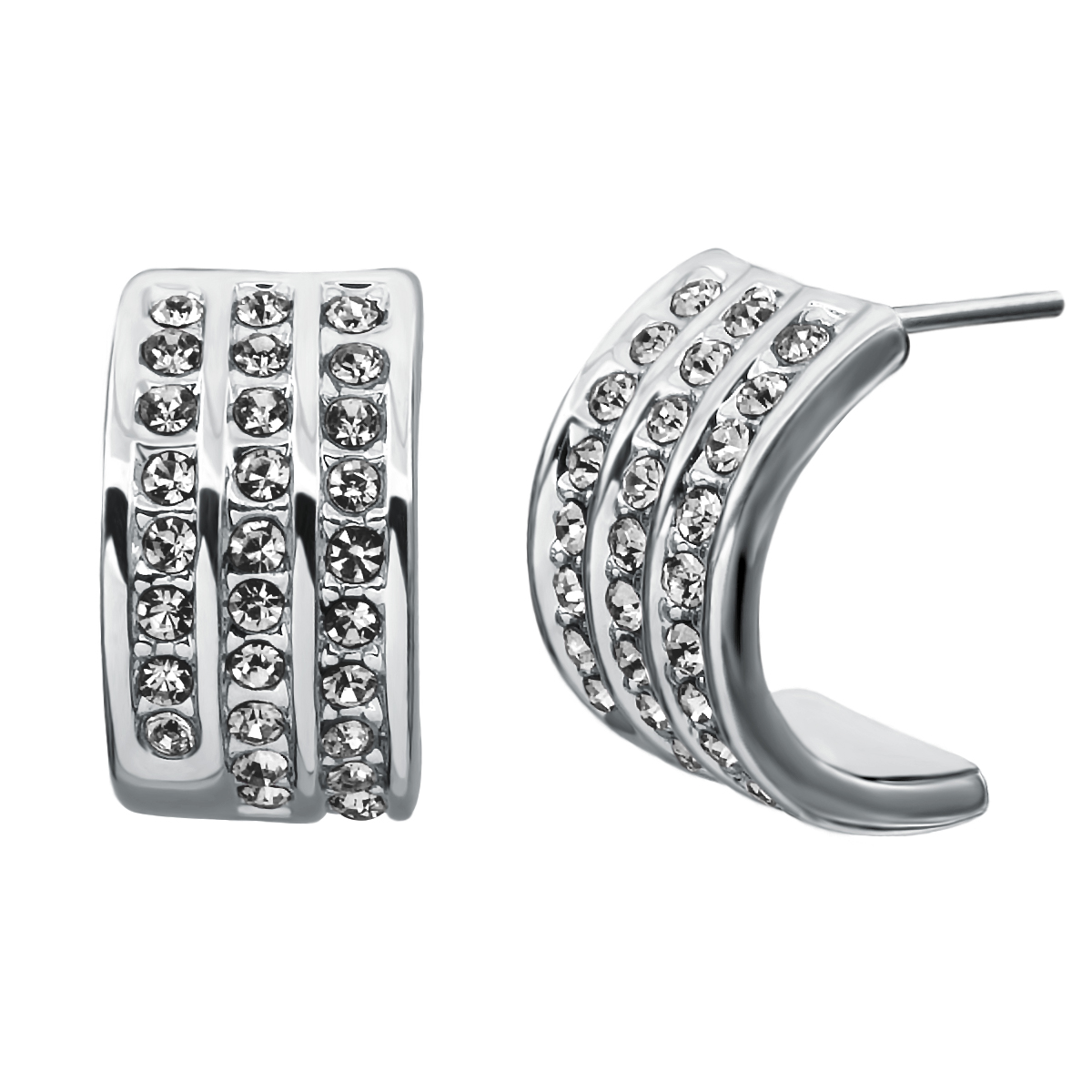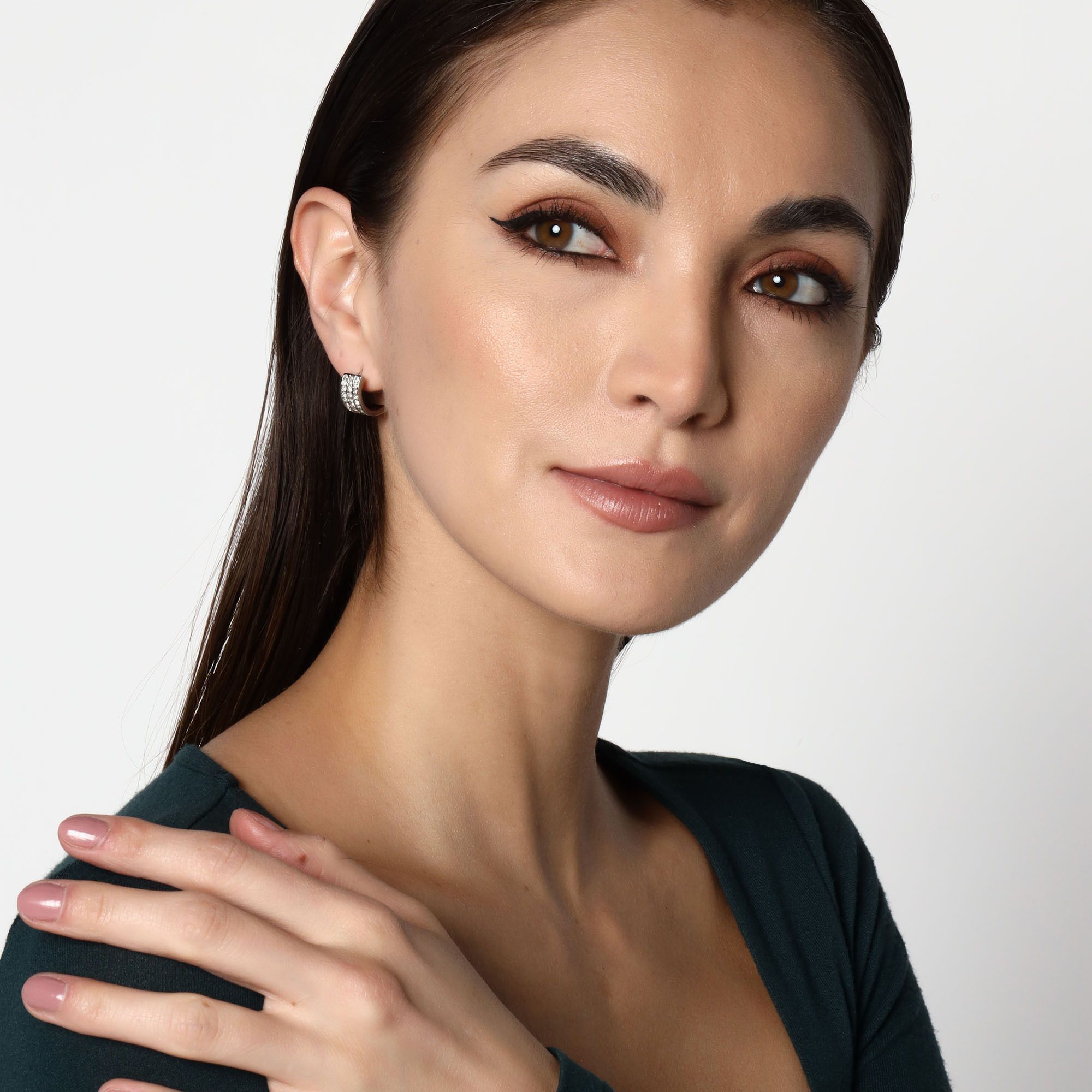 Finos aretes en baño de oro blanco de 18 quilates con incrustaciones de cristales en color blanco. Fabricado en una estructura de aleación de platino con rodio sin níquel.