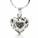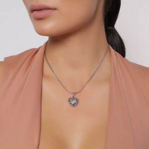 Precioso dije con cadena en baño de oro blanco de 18 quilates, diseño de corazón calado y detalles de chispas de cristales color blanco en su interior. Fabricado en una estructura de aleación de platino con rodio sin níquel.