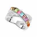 Elegante anillo en baño de oro blanco de 18 quilates , diseño de argolla cruzada con cristales de colores corte princesa e incrustaciones de cristales blancos. Fabricado en una estructura de aleación de platino con rodio sin níquel.